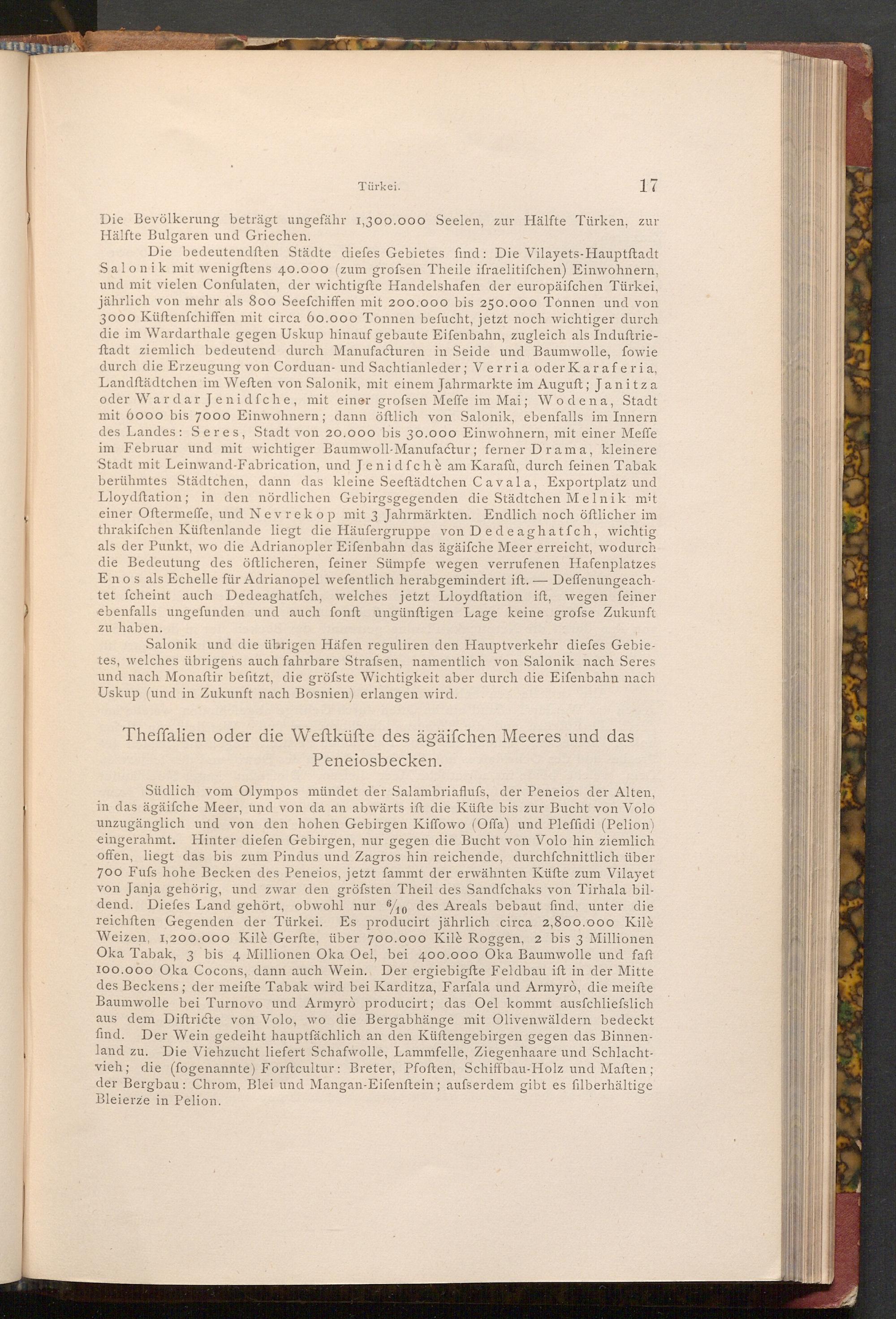 Südlich vom Olympos mündet der Salambriaflufs, der Peneios der Alten, in das ägäifche Meer, und von da an abwärts ift die Küfte bis zur Bucht von Volo unzugänglich und von den hohen Gebirgen Kiffowo( Offa) und Pleffidi( Pelion) eingerahmt. Hinter diefen Gebirgen, nur gegen die Bucht von Volo hin ziemlich offen, liegt das bis zum Pindus und Zagros hin reichende, durchfchnittlich über 700 Fufs hohe Becken des Peneios, jetzt fammt der erwähnten Küfte zum Vilayet von Janja gehörig, und zwar den gröfsten Theil des Sandfchaks von Tirhala bildend. Diefes Land gehört, obwohl nur 6/10 des Areals bebaut find, unter die reichften Gegenden der Türkei. Es producirt jährlich circa 2,800.000 Kilè Weizen, 1,200.000 Kilè Gerfte, über 700.000 Kilè Roggen, 2 bis 3 Millionen Oka Tabak, 3 bis 4 Millionen Oka Oel, bei 400.000 Oka Baumwolle und faft 100.000 Oka Cocons, dann auch Wein. Der ergiebigfte Feldbau ift in der Mitte des Beckens; der meifte Tabak wird bei Karditza, Farfala und Armyrò, die meiſte Baumwolle bei Turnovo und Armyrò producirt; das Oel kommt ausfchliesslich aus dem Diftricte von Volo, wo die Bergabhänge mit Olivenwäldern bedeckt find. Der Wein gedeiht hauptfächlich an den Küftengebirgen gegen das Binnenland zu. Die Viehzucht liefert Schafwolle, Lammfelle, Ziegenhaare und Schlachtvieh; die( fogenannte) Forftcultur: Breter, Pfoften, Schiffbau- Holz und Maften; der Bergbau: Chrom, Blei und Mangan- Eifenftein; aufserdem gibt es filberhältige Bleierze in Pelion.