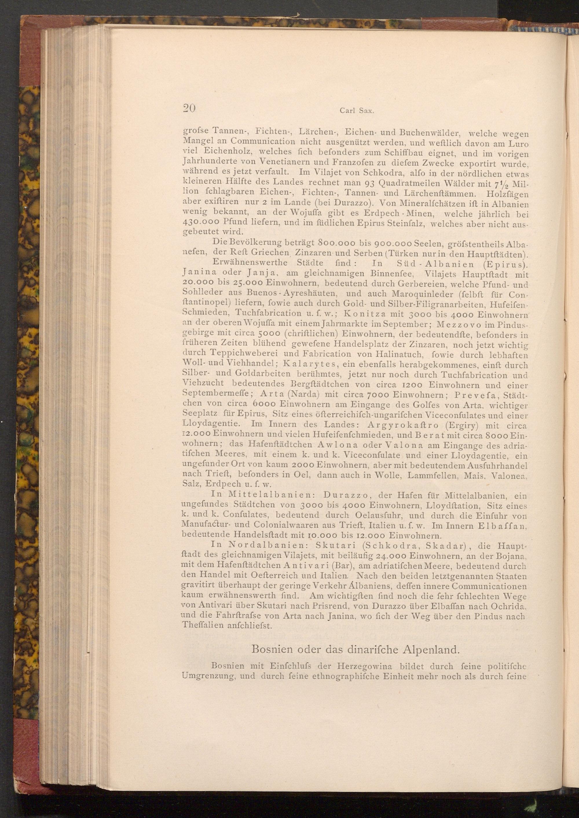 Die Bevölkerung beträgt 800.000 bis 900.000 Seelen, gröfstentheils Albanefen, der Reft Griechen, Zinzaren und Serben( Türken nur in den Hauptftädten). Erwähnenswerthe Städte find: In Süd Albanien( Epirus). Janina oder Janja, am gleichnamigen Binnenfee, Vilajets Hauptftadt mit 20.000 bis 25.000 Einwohnern, bedeutend durch Gerbereien, welche Pfund- und Sohlleder aus Buenos Ayreshäuten, und auch Maroquinleder( felbft für Conftantinopel) liefern, fowie auch durch Gold- und Silber- Filigranarbeiten, HufeifenSchmieden, Tuchfabrication u. f. w.; Konitza mit 3000 bis 4000 Einwohnern an der oberen Wojuffa mit einem Jahrmarkte im September; Mezzovo im Pindusgebirge mit circa 5000( chriftlichen) Einwohnern, der bedeutendfte, befonders in früheren Zeiten blühend gewefene Handelsplatz der Zinzaren, noch jetzt wichtig durch Teppichweberei und Fabrication von Halinatuch, fowie durch lebhaften Woll- und Viehhandel; Kalarytes, ein ebenfalls herabgekommenes, einft durch Silber und Goldarbeiten berühmtes, jetzt nur noch durch Tuchfabrication und Viehzucht bedeutendes Bergftädtchen von circa 1200 Einwohnern und einer Septembermeffe; Arta( Narda) mit circa 7000 Einwohnern; Prevefa, Städtchen von circa 6000 Einwohnern am Eingange des Golfes von Arta, wichtiger Seeplatz für Epirus, Sitz eines öfterreichiſch- ungarifchen Viceconfulates und einer Lloydagentie. Im Innern des Landes: Argyrokaftro( Ergiry) mit circa 12.000 Einwohnern und vielen Hufeifenfchmieden, und Berat mit circa 8000 Einwohnern; das Hafenftädtchen Awlona oder Valona am Eingange des adriatifchen Meeres, mit einem k. und k. Viceconfulate und einer Lloydagentie, ein ungefunder Ort von kaum 2000 Einwohnern, aber mit bedeutendem Ausfuhrhandel nach Trieft, befonders in Oel, dann auch in Wolle, Lammfellen, Mais, Valonea, Salz, Erdpech u. f. w.