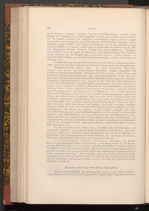 In Nordalbanien: Skutari( Schkodra, Skadar), die Hauptftadt des gleichnamigen Vilajets, mit beiläufig 24.000 Einwohnern, an der Bojana, mit dem Hafenftädtchen Antivari( Bar), am adriatifchen Meere, bedeutend durch den Handel mit Oefterreich und Italien. Nach den beiden letztgenannten Staaten gravitirt überhaupt der geringe Verkehr Albaniens, deffen innere Communicationen kaum erwähnenswerth find. Am wichtigften find noch die fehr fchlechten Wege von Antivari über Skutari nach Prisrend, von Durazzo über Elbaffan nach Ochrida. und die Fahrftrafse von Arta nach Janina, wo fich der Weg über den Pindus nach Theffalien anfchliefst.