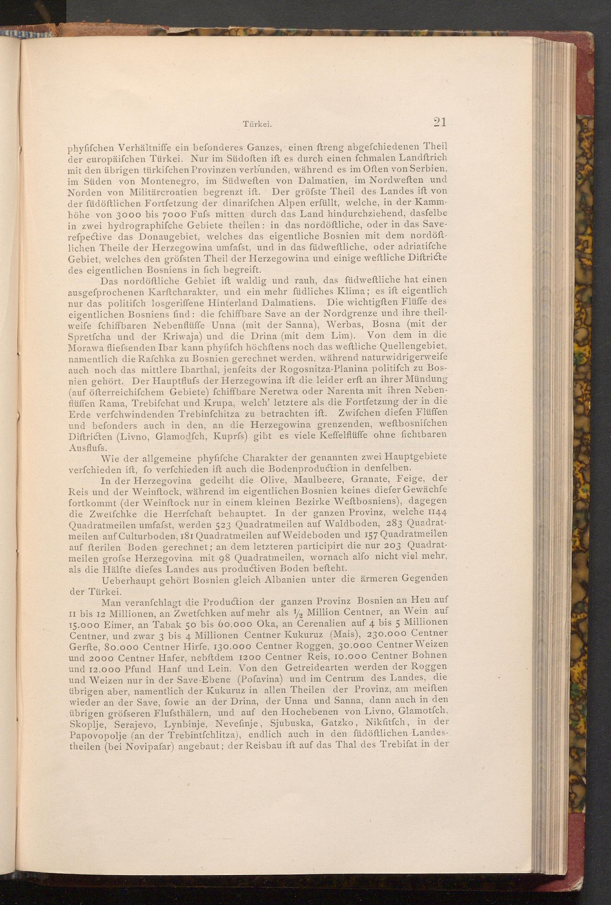 In der Herzegovina gedeiht die Olive, Maulbeere, Granate, Feige, der Reis und der Weinftock, während im eigentlichen Bosnien keines diefer Gewächfe fortkommt( der Weinftock nur in einem kleinen Bezirke Weftbosniens), dagegen die Zwetfchke die Herrfchaft behauptet. In der ganzen Provinz, welche 1144 Quadratmeilen umfafst, werden 523 Quadratmeilen auf Waldboden, 283 Quadratmeilen auf Culturboden, 181 Quadratmeilen auf Weideboden und 157 Quadratmeilen auf fterilen Boden gerechnet; an dem letzteren participirt die nur 203 Quadratmeilen grofse Herzegovina mit 98 Quadratmeilen, wornach alfo nicht viel mehr, als die Hälfte diefes Landes aus productiven Boden befteht.