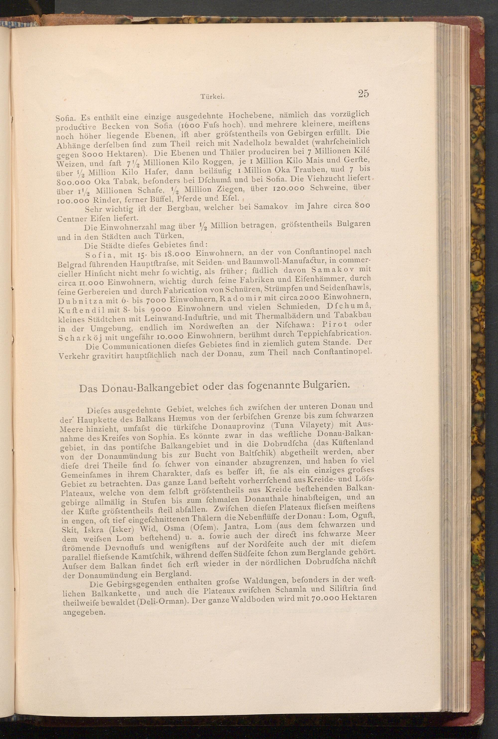Diefes ausgedehnte Gebiet, welches fich zwifchen der unteren Donau und der Haupkette des Balkans Hæmus von der ferbifchen Grenze bis zum fchwarzen Meere hinzieht, umfafst die türkifche Donauprovinz( Tuna Vilayety) mit Ausnahme des Kreifes von Sophia. Es könnte zwar in das weftliche Donau- Balkangebiet, in das pontifche Balkangebiet und in die Dobrudfcha( das Küftenland von der Donaumündung bis zur Bucht von Baltfchik) abgetheilt werden, aber diefe drei Theile find fo, fchwer von einander abzugrenzen, und haben fo viel Gemeinfames in ihrem Charakter, dafs es beffer ift, fie als ein einziges grofses Gebiet zu betrachten. Das ganze Land befteht vorherrfchend aus Kreide- und LöfsPlateaux, welche von dem felbft gröfstentheils aus Kreide beftehenden Balkangebirge allmälig in Stufen bis zum fchmalen Donauthale hinabfteigen, und an der Küfte gröfstentheils fteil abfallen. Zwifchen diefen Plateaux fliefsen meiftens in engen, oft tief eingefchnittenen Thälern die Nebenflüffe der Donau: Lom, Oguft, Skit, Iskra( Isker) Wid, Osma( Ofem). Jantra, Lom( aus dem fchwarzen und dem weifsen Lom beftehend) u. a. fowie auch der direct ins fchwarze Meer ftrömende Devnoflufs und wenigftens auf der Nordfeite auch der mit diefem parallel fliefsende Kamtfchik, während deffen Südfeite fchon zum Berglande gehört. Aufser dem Balkan findet fich erft wieder in der nördlichen Dobrudfcha nächft der Donaumündung ein Bergland.