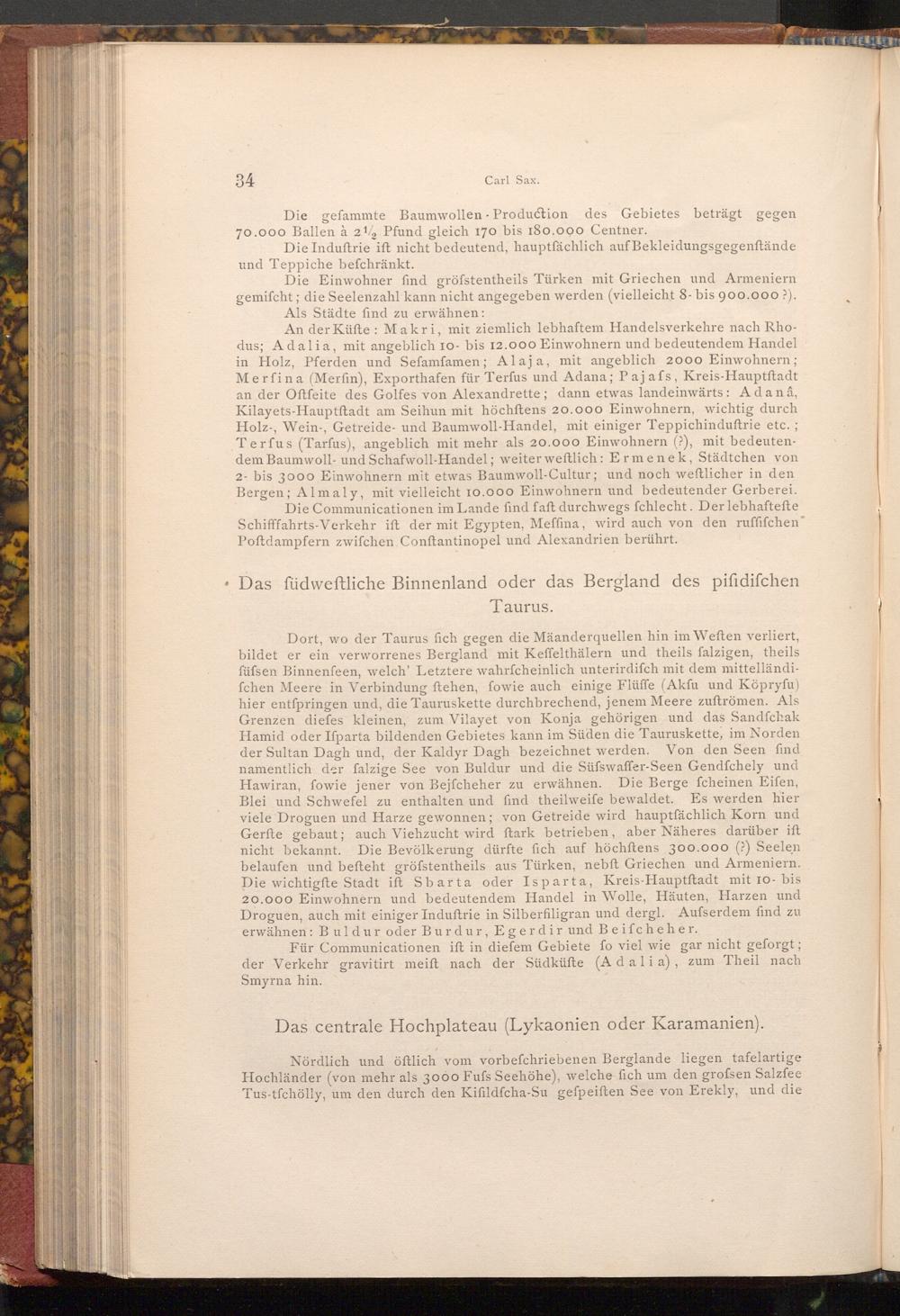 Dort, wo der Taurus fich gegen die Mäanderquellen hin im Weften verliert, bildet er ein verworrenes Bergland mit Keffelthälern und theils falzigen, theils füfsen Binnenfeen, welch' Letztere wahrfcheinlich unterirdifch mit dem mittelländifchen Meere in Verbindung ftehen, fowie auch einige Flüffe( Akfu und Köpryfu) hier entfpringen und, die Tauruskette durchbrechend, jenem Meere zuftrömen. Als Grenzen diefes kleinen, zum Vilayet von Konja gehörigen und das Sandfchak Hamid oder Ifparta bildenden Gebietes kann im Süden die Tauruskette, im Norden der Sultan Dagh und, der Kaldyr Dagh bezeichnet werden. Von den Seen find namentlich der falzige See von Buldur und die Süfswaffer- Seen Gendfchely und Hawiran, fowie jener von Bejfcheher zu erwähnen. Die Berge fcheinen Eifen, Blei und Schwefel zu enthalten und find theilweife bewaldet. Es werden hier viele Droguen und Harze gewonnen; von Getreide wird hauptfächlich Korn und Gerfte gebaut; auch Viehzucht wird ftark betrieben, aber Näheres darüber ift nicht bekannt. Die Bevölkerung dürfte fich auf höchftens 300.000(?) Seelen belaufen und befteht gröfstentheils aus Türken, nebft Griechen und Armeniern. Die wichtigfte Stadt ift Sbarta oder Isparta, Kreis- Hauptftadt mit 10- bis 20.000 Einwohnern und bedeutendem Handel in Wolle, Häuten, Harzen und Droguen, auch mit einiger Induftrie in Silberfiligran und dergl. Aufserdem find zu erwähnen: Buldur oder Burdur, Egerdir und Beifcheher.
