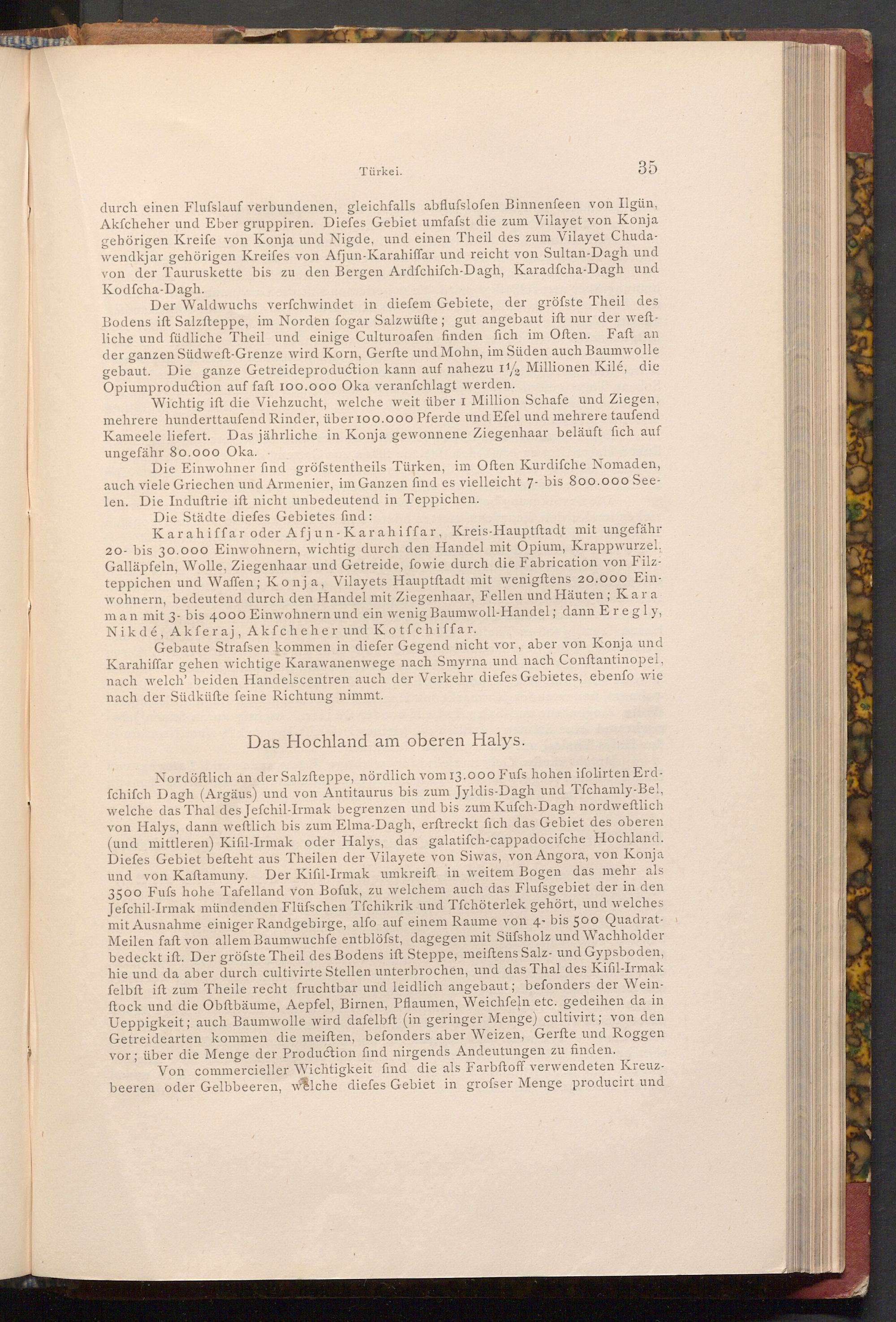 Nordöftlich an der Salzfteppe, nördlich vom 13.000 Fufs hohen ifolirten Erdfchifch Dagh( Argäus) und von Antitaurus bis zum Jyldis- Dagh und Tfchamly- Bel, welche das Thal des Jefchil- Irmak begrenzen und bis zum Kufch- Dagh nordweftlich von Halys, dann weftlich bis zum Elma- Dagh, erftreckt fich das Gebiet des oberen ( und mittleren) Kifil- Irmak oder Halys, das galatifch- cappadocifche Hochland. Diefes Gebiet befteht aus Theilen der Vilayete von Siwas, von Angora, von Konja und von Kaftamuny. Der Kifil- Irmak umkreift in weitem Bogen das mehr als 3500 Fufs hohe Tafelland von Bofuk, zu welchem auch das Flufsgebiet der in den Jefchil- Irmak mündenden Flüfschen Tfchikrik und Tfchöterlek gehört, und welches mit Ausnahme einiger Randgebirge, alfo auf einem Raume von 4- bis 500 QuadratMeilen faft von allem Baumwuchfe entblöfst, dagegen mit Süfsholz und Wachholder bedeckt ift. Der gröfste Theil des Bodens ift Steppe, meiftens Salz- und Gypsboden, hie und da aber durch cultivirte Stellen unterbrochen, und das Thal des Kifil- Irmak felbft ift zum Theile recht fruchtbar und leidlich angebaut; befonders der Weinftock und die Obftbäume, Aepfel, Birnen, Pflaumen, Weichfeln etc. gedeihen da in Ueppigkeit; auch Baumwolle wird dafelbft( in geringer Menge) cultivirt; von den Getreidearten kommen die meiften, befonders aber Weizen, Gerfte und Roggen vor; über die Menge der Production find nirgends Andeutungen zu finden.