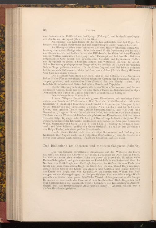 Durch diefes Gebiet zieht der wichtige Karawanen- und Poftweg von Kaiffarieh über Angora nach Ismid( refpective Conftantinopel) und die Strafse von Siwas über Amafia nach Samfun. Fahrbare Chaufféen exiftiren nicht.