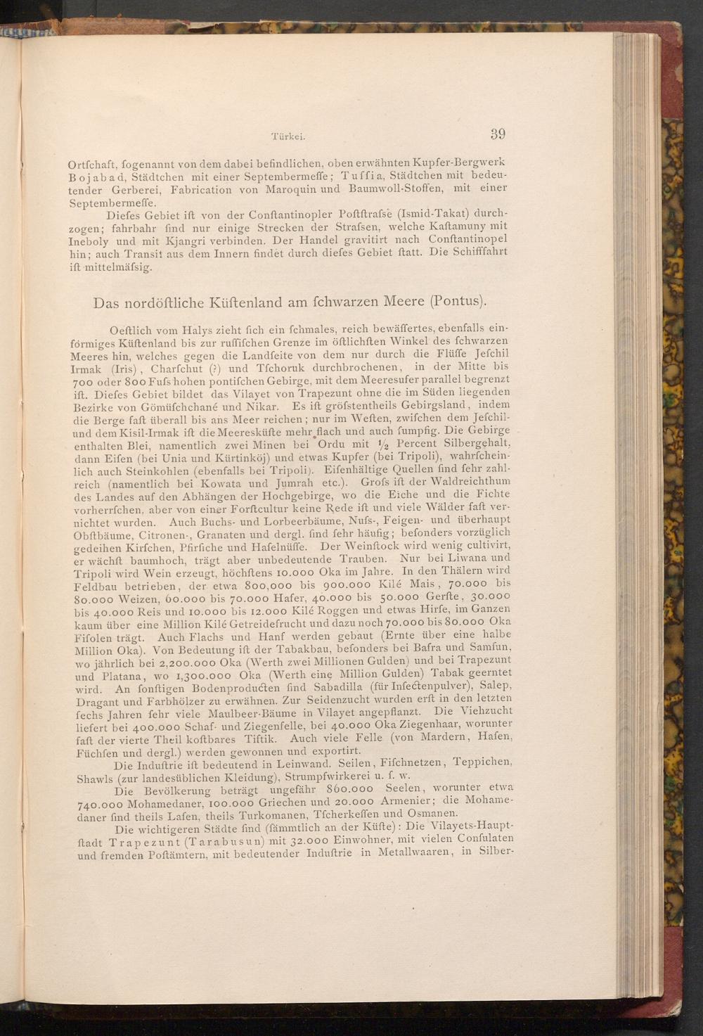 Oeftlich vom Halys zieht fich ein fchmales, reich bewäffertes, ebenfalls einförmiges Küftenland bis zur ruffifchen Grenze im öftlichften Winkel des fchwarzen Meeres hin, welches gegen die Landfeite von dem nur durch die Flüffe Jefchil Irmak( Iris), Charfchut(?) und Tfchoruk durchbrochenen, in der Mitte bis 700 oder 800 Fufs hohen pontifchen Gebirge, mit dem Meeresufer parallel begrenzt ift. Diefes Gebiet bildet das Vilayet von Trapezunt ohne die im Süden liegenden Bezirke von Gömüfchchané und Nikar. Es ift gröfstentheils Gebirgsland, indem die Berge faft überall bis ans Meer reichen; nur im Weften, zwifchen dem Jefchilund dem Kisil- Irmak ift die Meeresküfte mehr flach und auch fumpfig. Die Gebirge enthalten Blei, namentlich zwei Minen bei Ordu mit 2 Percent Silbergehalt, dann Eifen( bei Unia und Kürtinköj) und etwas Kupfer( bei Tripoli), wahrfcheinlich auch Steinkohlen( ebenfalls bei Tripoli). Eifenhältige Quellen find fehr zahlreich( namentlich bei Kowata und Jumrah etc.). Grofs ift der Waldreichthum des Landes auf den Abhängen der Hochgebirge, wo die Eiche und die Fichte vorherrfchen, aber von einer Forftcultur keine Rede ift und viele Wälder faft vernichtet wurden. Auch Buchs- und Lorbeerbäume, Nufs-, Feigen- und überhaupt Obftbäume, Citronen-, Granaten und dergl. find fehr häufig; befonders vorzüglich gedeihen Kirfchen, Pfirfiche und Hafelnüffe. Der Weinftock wird wenig cultivirt, er wächft baumhoch, trägt aber unbedeutende Trauben. Nur bei Liwana und Tripoli wird Wein erzeugt, höchftens 10.000 Oka im Jahre. In den Thälern wird Feldbau betrieben, der etwa 800,000 bis 900.000 Kilé Mais, 70.000 bis 80.000 Weizen, 60.000 bis 70.000 Hafer, 40.000 bis 50.000 Gerfte, 30.000 bis 40.000 Reis und 10.000 bis 12.000 Kilé Roggen und etwas Hirfe, im Ganzen kaum über eine Million Kilé Getreidefrucht und dazu noch 70.000 bis 80.000 Oka Fifolen trägt. Auch Flachs und Hanf werden gebaut( Ernte über eine halbe Million Oka). Von Bedeutung ift der Tabakbau, befonders bei Bafra und Samfun, wo jährlich bei 2,200.000 Oka( Werth zwei Millionen Gulden) und bei Trapezunt und Platana, wo 1,300.000 Oka( Werth eine Million Gulden) Tabak geerntet wird. An fonftigen Bodenproducten find Sabadilla( für Infectenpulver), Salep, Dragant und Farbhölzer zu erwähnen. Zur Seidenzucht wurden erft in den letzten fechs Jahren fehr viele Maulbeer- Bäume in Vilayet angepflanzt. Die Viehzucht liefert bei 400.000 Schaf und Ziegenfelle, bei 40.000 Oka Ziegenhaar, worunter faft der vierte Theil koftbares Tiftik. Auch viele Felle( von Mardern, Hafen, Füchfen und dergl.) werden gewonnen und exportirt.