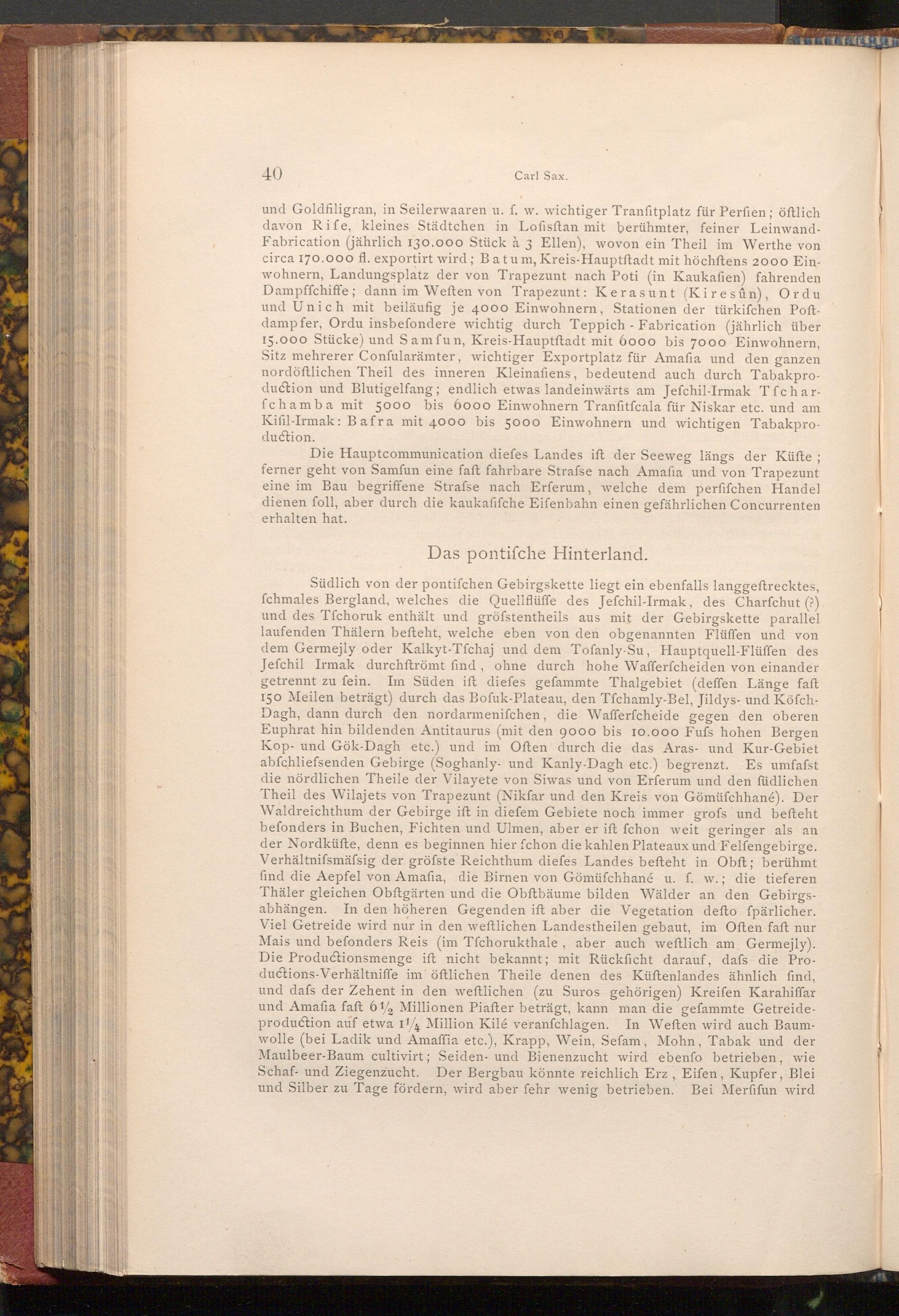 und Goldfiligran, in Seilerwaaren u. f. w. wichtiger Tranfitplatz für Perfien; öftlich davon Rife, kleines Städtchen in Lofisftan mit berühmter, feiner LeinwandFabrication( jährlich 130.000 Stück à 3 Ellen), wovon ein Theil im Werthe von circa 170.000 fl. exportirt wird; Batum, Kreis- Hauptftadt mit höchftens 2000 Einwohnern, Landungsplatz der von Trapezunt nach Poti( in Kaukafien) fahrenden Dampffchiffe; dann im Weften von Trapezunt: Kerasunt( Kiresûn), Ordu und Unich mit beiläufig je 4000 Einwohnern, Stationen der türkifchen Poftdampfer, Ordu insbefondere wichtig durch Teppich Fabrication( jährlich über 15.000 Stücke) und Samfun, Kreis- Hauptftadt mit 6000 bis 7000 Einwohnern, Sitz mehrerer Confularämter, wichtiger Exportplatz für Amafia und den ganzen nordöftlichen Theil des inneren Kleinafiens, bedeutend auch durch Tabakproduction und Blutigelfang; endlich etwas landeinwärts am Jefchil- Irmak Tfcharfchamba mit 5000 bis 6000 Einwohnern Tranfitfcala für Niskar etc. und am Kifil- Irmak: Bafra mit 4000 bis 5000 Einwohnern und wichtigen Tabakproduction.