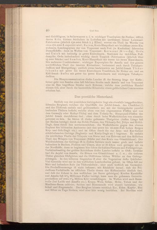 Südlich von der pontifchen Gebirgskette liegt ein ebenfalls langgeftrecktes, fchmales Bergland, welches die Quellflüffe des Jefchil- Irmak, des Charfchut(?) und des Tfchoruk enthält und gröfstentheils aus mit der Gebirgskette parallel laufenden Thälern befteht, welche eben von den obgenannten Flüffen und von dem Germejly oder Kalkyt- Tfchaj und dem Tofanly- Su, Hauptquell- Flüffen des Jefchil Irmak durchftrömt find, ohne durch hohe Wafferfcheiden von einander getrennt zu fein. Im Süden ift diefes gefammte Thalgebiet( deffen Länge faft 150 Meilen beträgt) durch das Bofuk- Plateau, den Tfchamly- Bel, Jildys- und KöfchDagh, dann durch den nordarmenifchen, die Wafferfcheide gegen den oberen. Euphrat hin bildenden Antitaurus( mit den 9000 bis 10.000 Fufs hohen Bergen. Kop- und Gök- Dagh etc.) und im Often durch die das Aras- und Kur- Gebiet abfchliefsenden Gebirge( Soghanly- und Kanly- Dagh etc.) begrenzt. Es umfafst die nördlichen Theile der Vilayete von Siwas und von Erferum und den füdlichen Theil des Wilajets von Trapezunt( Nikfar und den Kreis von Gömüfchhané). Der Waldreichthum der Gebirge ift in diefem Gebiete noch immer grofs und befteht befonders in Buchen, Fichten und Ulmen, aber er ift fchon weit geringer als an der Nordküfte, denn es beginnen hier fchon die kahlen Plateaux und Felfengebirge. Verhältnifsmäfsig der gröfste Reichthum diefes Landes befteht in Obft; berühmt find die Aepfel von Amafia, die Birnen von Gömüfchhané u. f. w.; die tieferen Thäler gleichen Obftgärten und die Obftbäume bilden Wälder an den Gebirgsabhängen. In den höheren Gegenden ift aber die Vegetation defto fpärlicher. Viel Getreide wird nur in den weftlichen Landestheilen gebaut, im Often faft nur Mais und befonders Reis( im Tfchorukthale, aber auch weftlich am Germejly). Die Productionsmenge ift nicht bekannt; mit Rückficht darauf, dafs die Productions- Verhältniffe im öftlichen Theile denen des Küftenlandes ähnlich find, und dafs der Zehent in den weftlichen( zu Suros gehörigen) Kreifen Karahiffar und Amafia faft 612 Millionen Piafter beträgt, kann man die gefammte Getreideproduction auf etwa 14 Million Kilé veranfchlagen. In Weften wird auch Baumwolle( bei Ladik und Amaffia etc.), Krapp, Wein, Sefam, Mohn, Tabak und der Maulbeer- Baum cultivirt; Seiden- und Bienenzucht wird ebenfo betrieben, wie Schaf und Ziegenzucht. Der Bergbau könnte reichlich Erz, Eifen, Kupfer, Blei und Silber zu Tage fördern, wird aber fehr wenig betrieben. Bei Merfifun wird