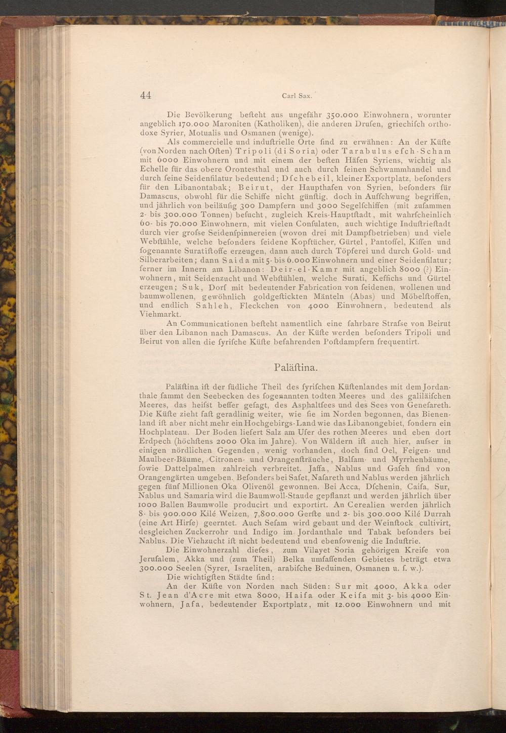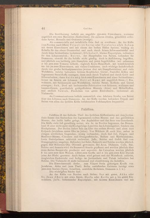 Paläftina ift der füdliche Theil des fyrifchen Küftenlandes mit dem Jordanthale fammt den Seebecken des fogenannten todten Meeres und des galiläifchen Meeres, das heifst beffer gefagt, des Asphaltfees und des Sees von Genefareth. Die Küfte zieht faft geradlinig weiter, wie fie im Norden begonnen, das Bienenland ift aber nicht mehr ein Hochgebirgs- Land wie das Libanongebiet, fondern ein Hochplateau. Der Boden liefert Salz am Ufer des rothen Meeres und eben dort Erdpech( höchftens 2000 Oka im Jahre). Von Wäldern ift auch hier, aufser in einigen nördlichen Gegenden, wenig vorhanden, doch find Oel, Feigen- und Maulbeer- Bäume, Citronen- und Orangenfträuche, Balfam- und Myrrhenbäume, fowie Dattelpalmen zahlreich verbreitet. Jaffa, Nablus und Gafeh find von Orangengärten umgeben. Befonders bei Safet, Nafareth und Nablus werden jährlich gegen fünf Millionen Oka Olivenöl gewonnen. Bei Acca, Dfchenin, Caifa, Sur, Nablus und Samaria wird die Baumwoll- Staude gepflanzt und werden jährlich über 1000 Ballen Baumwolle producirt und exportirt. An Cerealien werden jährlich 8. bis 900.000 Kilé Weizen, 7,800.000 Gerfte und 2- bis 300.000 Kilé Durrah ( eine Art Hirfe) geerntet. Auch Sefam wird gebaut und der Weinftock cultivirt, desgleichen Zuckerrohr und Indigo im Jordanthale und Tabak befonders bei Nablus. Die Viehzucht ift nicht bedeutend und ebenfowenig die Induſtrie.