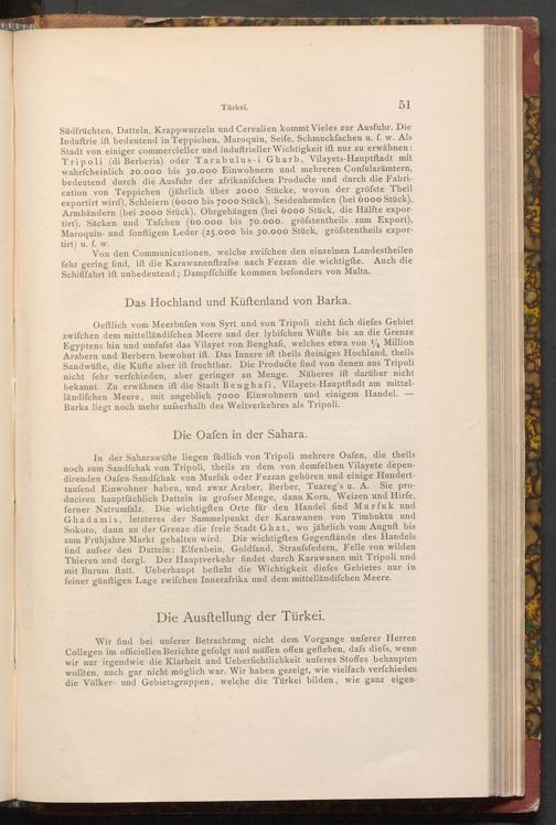 51 Südfrüchten, Datteln, Krappwurzeln und Cerealien kommt Vieles zur Ausfuhr. Die Induftrie ift bedeutend in Teppichen, Maroquin, Seife, Schmuckfachen u. f. w. Als Stadt von einiger commercieller und induftrieller Wichtigkeit ift nur zu erwähnen: Tripoli( di Berberia) oder Tarabulus- i Gharb, Vilayets- Hauptftadt mit wahrfcheinlich 20.000 bis 30.000 Einwohnern und mehreren Confularämtern, bedeutend durch die Ausfuhr der afrikanifchen Producte und durch die Fabrication von Teppichen( jährlich über 2000 Stücke, wovon der gröfste Theil exportirt wird), Schleiern( 6000 bis 7000 Stück), Seidenhemden( bei 6000 Stück), Armbändern( bei 2000 Stück), Ohrgehängen( bei 6000 Stück, die Hälfte exportirt), Säcken und Tafchen( 60.000 bis 70.000. gröfstentheils zum Export), Maroquin- und fonftigem Leder( 25.000 bis 30.000 Stück, gröfstentheils exportirt) u. f. w.