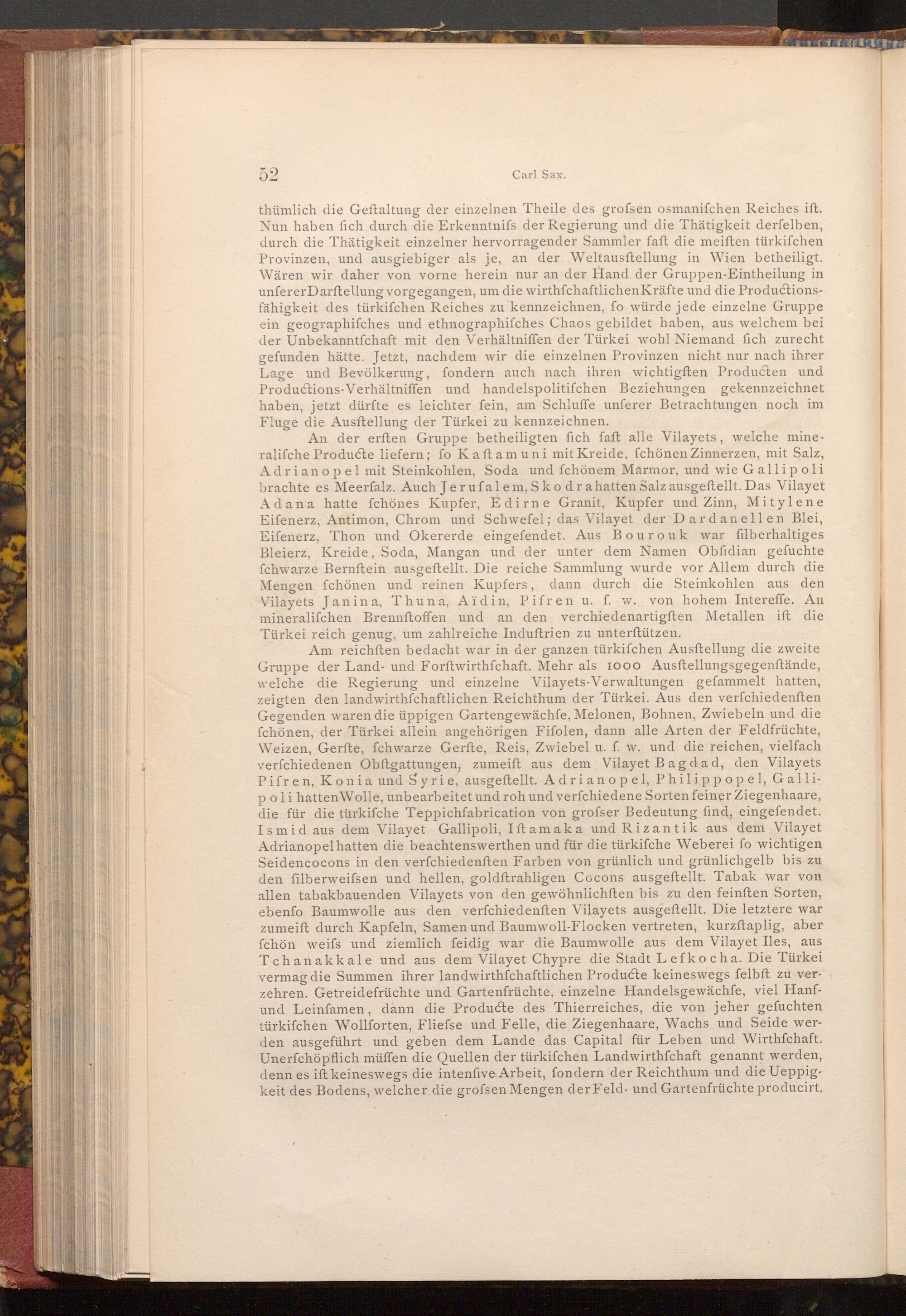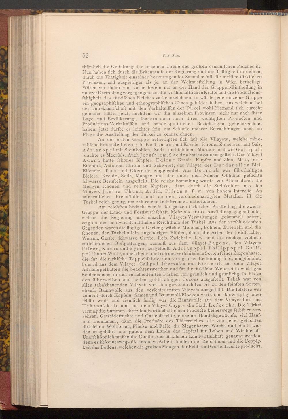An der erften Gruppe betheiligten fich faft alle Vilayets, welche mineralifche Producte liefern; fo Kaftamuni mit Kreide, fchönen Zinnerzen, mit Salz, Adrianopel mit Steinkohlen, Soda und fchönem Marmor, und wie Gallipoli brachte es Meerfalz. Auch Jerufalem, Skodra hatten Salz ausgeftellt. Das Vilayet Adana hatte fchönes Kupfer, Edirne Granit, Kupfer und Zinn, Mitylene Eifenerz, Antimon, Chrom und Schwefel; das Vilayet der Dardanellen Blei, Eifenerz, Thon und Okererde eingefendet. Aus Bourouk war filberhaltiges Bleierz, Kreide, Soda, Mangan und der unter dem Namen Obfidian geſuchte fchwarze Bernftein ausgeftellt. Die reiche Sammlung wurde vor Allem durch die Mengen fchönen und reinen Kupfers, dann durch die Steinkohlen aus den Vilayets Janina, Thuna, Aïdin, Pifren u. f. w. von hohem Intereffe. An mineralifchen Brennftoffen und an den verchiedenartigften Metallen ift die Türkei reich genug, um zahlreiche Induftrien zu unterſtützen.