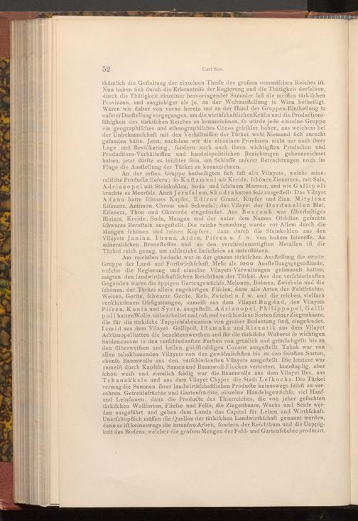 thümlich die Geftaltung der einzelnen Theile des grofsen osmanifchen Reiches ift. Nun haben fich durch die Erkenntnifs der Regierung und die Thätigkeit derfelben, durch die Thätigkeit einzelner hervorragender Sammler faft die meiſten türkifchen Provinzen, und ausgiebiger als je, an der Weltausftellung in Wien betheiligt. Wären wir daher von vorne herein nur an der Hand der Gruppen- Eintheilung in unferer Darstellung vorgegangen, um die wirthfchaftlichen Kräfte und die Productionsfähigkeit des türkifchen Reiches zu kennzeichnen, fo würde jede einzelne Gruppe ein geographifches und ethnographifches Chaos gebildet haben, aus welchem bei der Unbekanntfchaft mit den Verhältniffen der Türkei wohl Niemand fich zurecht gefunden hätte. Jetzt, nachdem wir die einzelnen Provinzen nicht nur nach ihrer Lage und Bevölkerung, fondern auch nach ihren wichtigften Producten und Productions- Verhältniffen und handelspolitifchen Beziehungen gekennzeichnet haben, jetzt dürfte es leichter fein, am Schluffe unferer Betrachtungen noch im Fluge die Ausstellung der Türkei zu kennzeichnen.