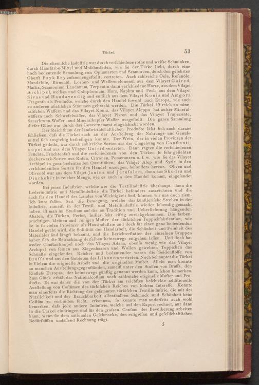 Die chemifche Induftrie war durch verfchiedene rothe und weifse Schminken, durch Haarfärbe- Mittel und Mofchusfeifen, wie fie der Türke liebt, durch eine hoch bedeutende Sammlung von Opiumarten und Scamoreen, durch den gelehrten Oberft Fay k Bey zufammengeftellt, vertreten. Auch zahlreiche Oele, Rofenöle, Mandelöle, Birnenöl, Lorber- und Waffermelonenöl aus dem Vilayet Guired, Maftix, Scamonium, Laudanum, Terpentin dann verfchiedene Harze, aus dem Vilajet Archipel, weifses und Colophonium, Harz, Naphta und Pech aus dem Vilayet Sivas und Haudavendig und endlich aus dem Vilayet Konia und Amgora Traganth als Producte, welche durch den Handel fowohl nach Europa, wie auch zu anderen afiatifchen Stämmen gebracht werden. Die Türkei ift reich an mineralifchen Wäffern und das Vilayet Konia, das Vilayet Aleppo hat aufser Mineralwäffern auch Schwefelwäffer, das Vilayet Pisren und das Vilayet Trapezonte, Sauerbrunn- Waffer und Mineralkupfer- Waffer ausgeftellt. Die ganze Sammlung diefer Güter war durch das Gouvernement eingefchickt worden.