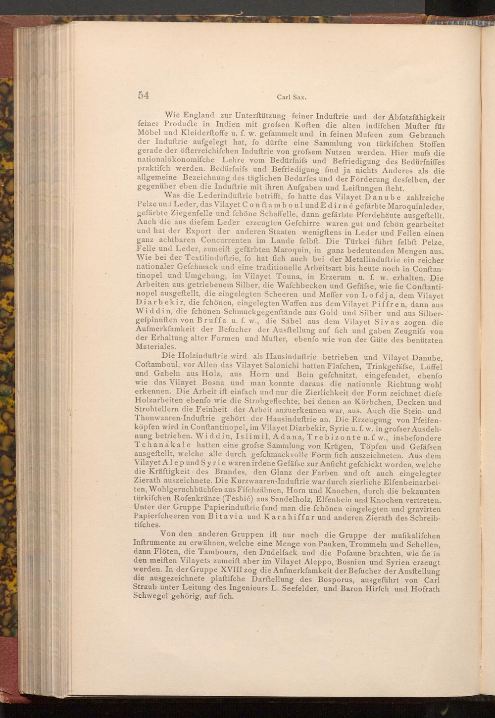 Wie England zur Unterſtützung feiner Induftrie und der Abfatzfähigkeit feiner Producte in Indien mit grofsen Koften die alten indifchen Mufter für Möbel und Kleiderftoffe u. f. w. gefammelt und in feinen Muſeen zum Gebrauch der Induſtrie aufgelegt hat, fo dürfte eine Sammlung von türkifchen Stoffen gerade der öfterreichifchen Induftrie von grofsem Nutzen werden. Hier mufs die nationalökonomifche Lehre vom Bedürfnifs und Befriedigung des Bedürfniffes praktiſch werden. Bedürfnifs und Befriedigung find ja nichts Anderes als die allgemeine Bezeichnung des täglichen Bedarfes und der Förderung desfelben, der gegenüber eben die Induſtrie mit ihren Aufgaben und Leiftungen steht.