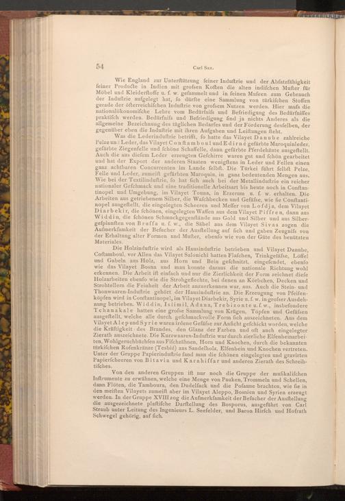 Von den anderen Gruppen ift nur noch die Gruppe der mufikalifchen Inftrumente zu erwähnen, welche eine Menge von Pauken, Trommeln und Schellen, dann Flöten, die Tamboura, den Dudelfack und die Pofaune brachten, wie fie in den meiften Vilayets zumeift aber im Vilayet Aleppo, Bosnien und Syrien erzeugt werden. In der Gruppe XVIII zog die Aufmerksamkeit der Befucher der Ausstellung die ausgezeichnete plaftifche Darftellung des Bosporus, ausgeführt von Carl Straub unter Leitung des Ingenieurs L. Seefelder, und Baron Hirfch und Hofrath Schwegel gehörig, auf fich.