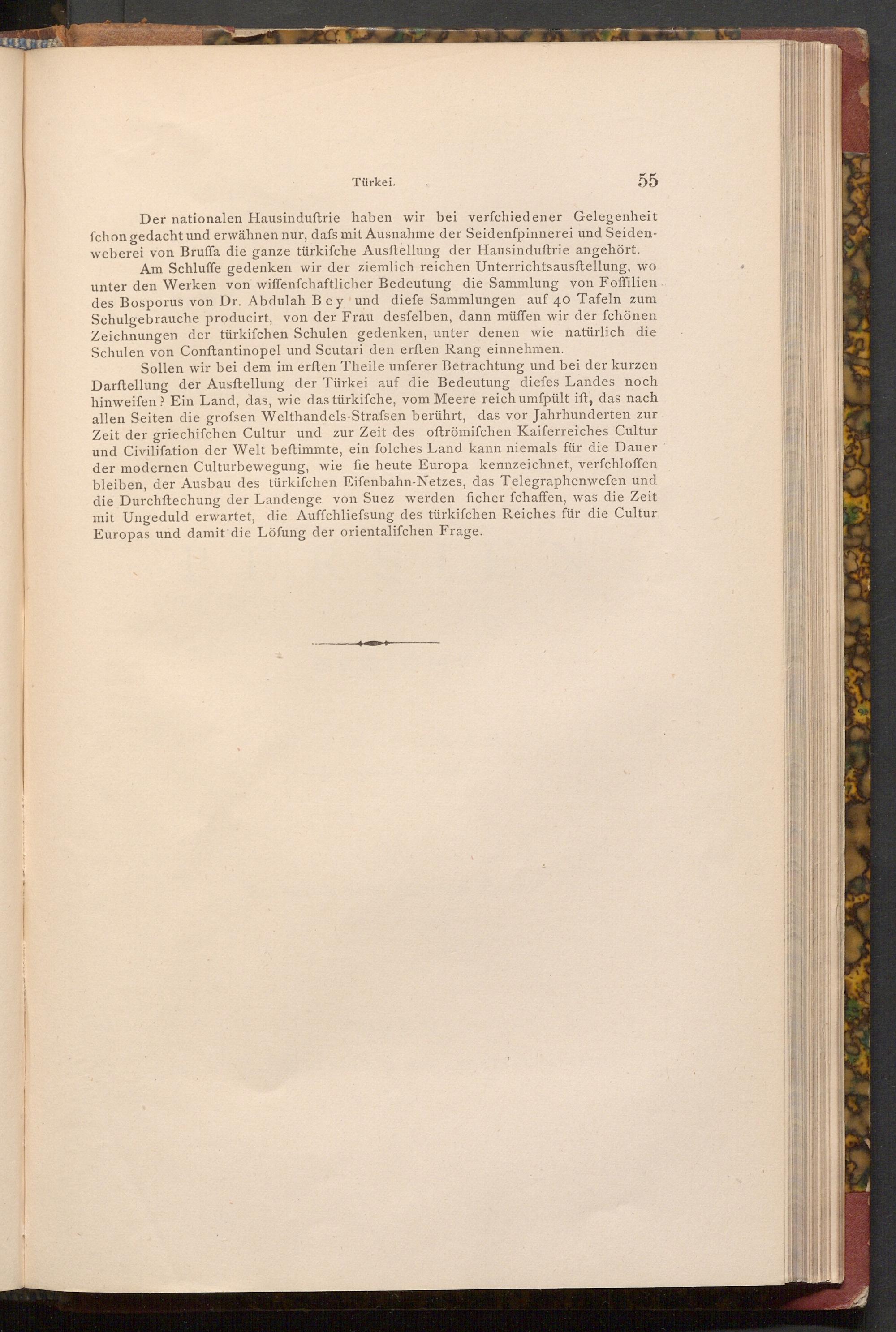 Sollen wir bei dem im erften Theile unferer Betrachtung und bei der kurzen Darftellung der Ausftellung der Türkei auf die Bedeutung diefes Landes noch hinweifen? Ein Land, das, wie das türkifche, vom Meere reich umfpült ift, das nach allen Seiten die grofsen Welthandels- Strafsen berührt, das vor Jahrhunderten zur Zeit der griechifchen Cultur und zur Zeit des oftrömifchen Kaiferreiches Cultur und Civilifation der Welt beftimmte, ein folches Land kann niemals für die Dauer der modernen Culturbewegung, wie fie heute Europa kennzeichnet, verfchloffen bleiben, der Ausbau des türkifchen Eifenbahn- Netzes, das Telegraphenwefen und die Durchftechung der Landenge von Suez werden ficher fchaffen, was die Zeit mit Ungeduld erwartet, die Auffchliefsung des türkifchen Reiches für die Cultur Europas und damit die Löfung der orientalifchen Frage.