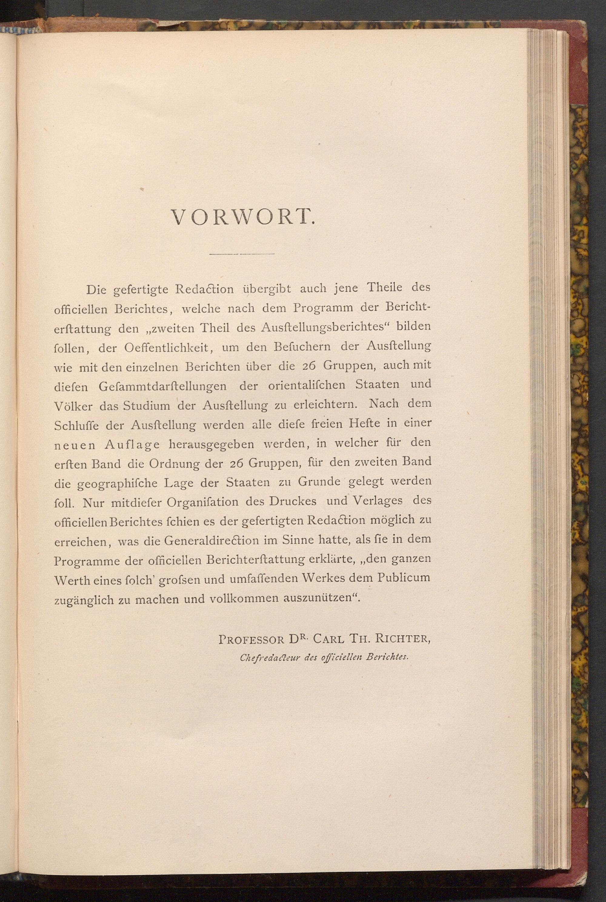 Die gefertigte Redaction übergibt auch jene Theile des officiellen Berichtes, welche nach dem Programm der Berichterftattung den ,, zweiten Theil des Ausftellungsberichtes" bilden follen, der Oeffentlichkeit, um den Befuchern der Ausftellung wie mit den einzelnen Berichten über die 26 Gruppen, auch mit diefen Gefammtdarftellungen der orientalifchen Staaten und Völker das Studium der Ausftellung zu erleichtern. Nach dem Schluffe der Ausftellung werden alle diefe freien Hefte in einer neuen Auflage herausgegeben werden, in welcher für den erften Band die Ordnung der 26 Gruppen, für den zweiten Band die geographifche Lage der Staaten zu Grunde gelegt werden foll. Nur mitdiefer Organiſation des Druckes und Verlages des officiellen Berichtes fchien es der gefertigten Redaction möglich zu erreichen, was die Generaldirection im Sinne hatte, als fie in dem Programme der officiellen Berichterstattung erklärte, ,, den ganzen Werth eines folch' grofsen und umfaffenden Werkes dem Publicum zugänglich zu machen und vollkommen auszunützen".