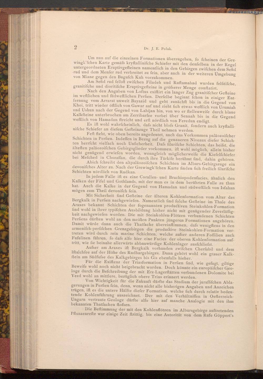 Mit Sicherheit find Gefteine der älteren Kohlenformation vom Alter des Bergkalk in Perfien nachgewiefen. Namentlich find folche Gefteine im Thale des Araxes bekannt Schichten der fogenannten productiven Steinkohlen- Formation find wohl in ihrer typifchen Ausbildung bisher nicht mit genügender Zuverläffigkeit nachgewiefen worden. Die mit Steinkohlen- Flötzen verbundenen Schichten Perfiens dürften wohl an den meiften Punkten jüngeren Formationen angehören. Damit würde dann auch die Thatfache übereinftimmen, dafs wenigftens in den armenifch- perfifchen Grenzgebirgen die productive Steinkohlen- Formation vertreten wird durch rein marine Schichten, welche aufser anderen Foffilien auch Fufulinen führen, fo dafs alfo hier eine Facies der oberen Kohlenformation auftritt, wie fie beinahe allerwärts abbauwürdige Kohlenlager ausfchliefst.