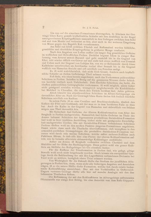 Von Wichtigkeit für die Zukunft dürfte das Studium der juraffifchen Ablagerungen in Perfien fein, denn, wenn nicht alle bisherigen Angaben und Anzeichen trügen, ift es die untere Hälfte diefer Formation, welche fich durch relativ bedeutende Kohlenführung auszeichnet. Der mit den Verhältniffen in OefterreichUngarn vertraute Geologe dürfte alfo hier auf manche Analogie mit den ihm bekannten Thatfachen ftofsen.