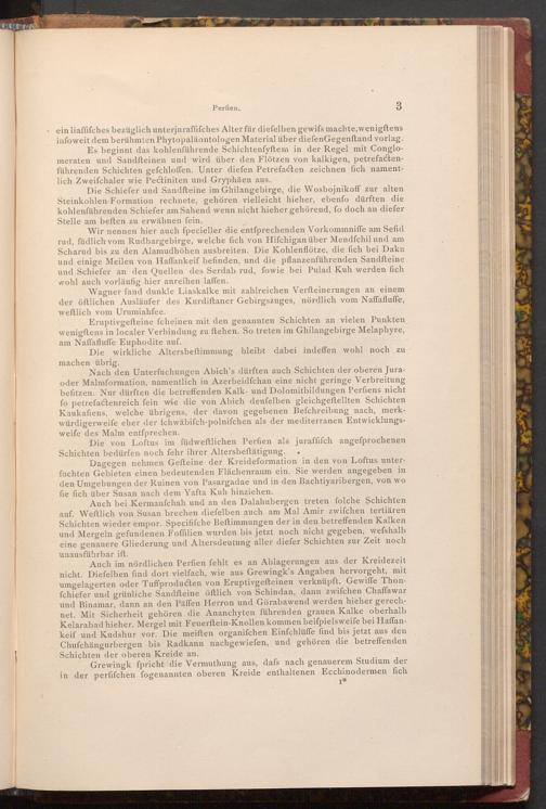 Auch bei Kermanfchah und an den Dalahubergen treten folche Schichten auf. Weftlich von Susan brechen diefelben auch am Mal Amir zwifchen tertiären Schichten wieder empor. Specififche Beftimmungen der in den betreffenden Kalken und Mergeln gefundenen Foffilien wurden bis jetzt noch nicht gegeben, wefshalb eine genauere Gliederung und Altersdeutung aller diefer Schichten zur Zeit noch unausführbar ift.