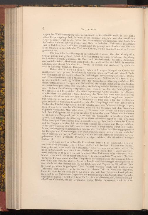 Ueber die Einwohnerzahl laffen fich wegen Mangel an Cenfus nur annähernde Daten geben. So fchätzt fie Mounfay in feinem Werke( 1872) nach Ende der Hungersnoth mit Zuhilfenahme der beiläufigen Bevölkerung der Städte, Dörfer und Nomadenftämme auf 5 Millionen, wovon etwa 1 Million auf die Städte-, 2½ auf die ländliche und 12 Million auf die Nomadenbevölkerung entfallen. Die vielen unfruchtbaren Steppen und Salzwüften, die wegen Befchaffung des Waffers nur oafenförmigen Plätze der möglichen Anfiedlung werden immer als Hinderniffe einer dichten Bevölkerung entgegenftehen. Ebenfo werden die hochgelegenen Weideplätze und Bergwiefen, die keine regelmässige Cultur zulaffen, der Abgang von Wäldern die gänzliche Unterdrückung des Nomadenthums ftets verhindern; es könnte höchftens mit der Zeit eine Art Sennerwirthschaft angebahnt werden. Uebrigens fei es weit entfernt, die Nomaden als Barbaren oder der Civilifation ganz entblöfste Menfchen hinzuftellen, da die Häuptlinge meift den gebildetften Claffen des Landes angehören, die für Schulen unter den Zelten auch Sorge tragen; auch ift das Kriterium der Civilifation, nämlich die Weberei, bei den Nomaden allgemein verbreitet. Man zählt etwa 150 Stämme, von denen die bedeutendften find: Die Kafchgaren bei Schiraz mit etwa 35.000 fchwarzen Zelten, die Kelhuren mit 11.000, die Zengeneh mit 10.000 und die Schegaghi in Azerbendfchan mit 15.000. Die fefshafte Bevölkerung ift in fteter Ahnahme hegriffen; die Urfachen diefes traurigen Verhältniffes liegen zumeift in der grofsen Sterblichkeit der Kinder und der Truppen, in den fich oft wiederholenden Epidemien und Hungersnöthen, in der Entvölkerung des öftlichen Reiches durch Menfchenraub durch die Turkeftaner, in dem geringen gefetzlichen Schutze der ländlichen Bevölkerung gegenüber der Habgier und Plünderungen der Regierungsbeamten u. f. w., daher auch bei den Nomaden, wo wegen Zerftreuung und natürlichen Schutzes von Seite der eingeborenen Chefs genannte Urfachen weniger wirken, die Abnahme weniger fühlbar ift.