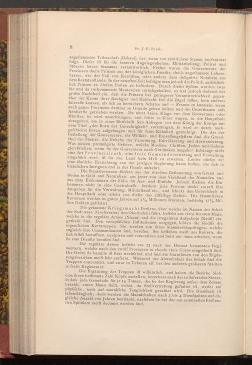 angeftammten Tribuschefs( Ilchani), der, wenn von türkifchem Stamm, im Seniorat folgt. Diefer ift für die inneren Angelegenheiten, Militärftellung, Polizei und Steuern feines Stammes verantwortlich. Früher waren die Gouverneure der Provinzen theils Prinzen aus der königlichen Familie, theils angeftammte Lehensherren, wie der Vali von Kurdiſtan, oder andere dazu defignirte Notabeln aus dem Beamtenftande. In der neueften Zeit befolgte man jedoch die Politik, ausfchliefslich Prinzen zu diefem Poften zu befördern. Durch diefes Syftem wurden zwar hie und da vorkommende Meutereien zurückgehalten, es trat jedoch dadurch der grofse Nachtheil ein, dafs die Prinzen bei geringerer Verantwortlichkeit gegenüber der Krone ihrer Raubgier und Habfucht frei die Zügel laffen, kein anderes Intereffe kennen, als fich zu bereichern, Schätze und Frauen zu fammeln, wenn auch ganze Provinzen darüber zu Grunde gehen follten und die Unterthanen aufs Aeufserfte getrieben werden. Da nützt keine Klage vor dem Gouverneur oder Minifter, fie wird unterfchlagen, und follte es Einer wagen, in die Hauptftadt abzugehen, um in einer Bittfchrift fein Anliegen vor dem König der Könige mit dem Titel ,, der Born der Gerechtigkeit" vorzutragen, fo wird er durch nachgefchickte Boten aufgefangen und für feine Kühnheit gezüchtigt. Die Art der Beftellung der Gouverneure, ihr Willkür- und Erpreffungsfyftem find die Grundübel des Staates, die Urfache der Verarmung, Entvölkerung und Auswanderung. Was nützen promulgirte Gefetze, welche Moslims, Chriften, Juden und Gebern gleichftellen, wenn fie der Gouverneur nach Gutdünken umgeht? Infolange nicht eine Art Provinzialrath, eine freie Gemeindevertretung und Verwaltung eingeführt wird, ift für das Land kein Heil zu erwarten. Leider dürfen wir eine ähnliche Einrichtung von der jetzigen Regierung kaum hoffen, die fich in kleinlichen Intriguen und in der Phrafe aufzehrt.