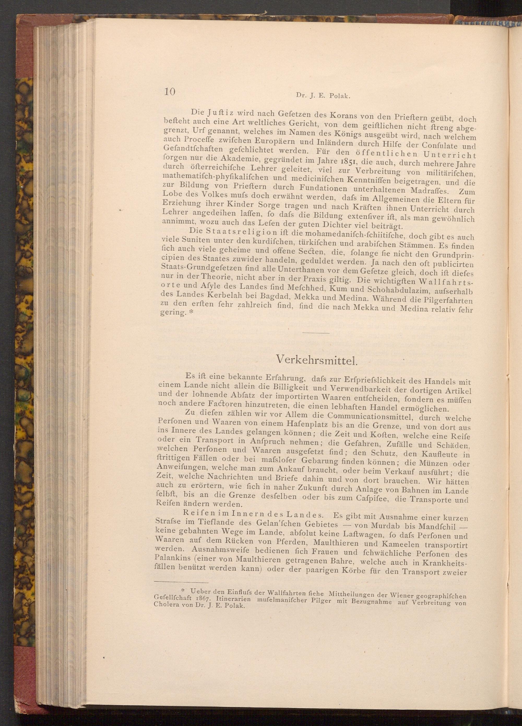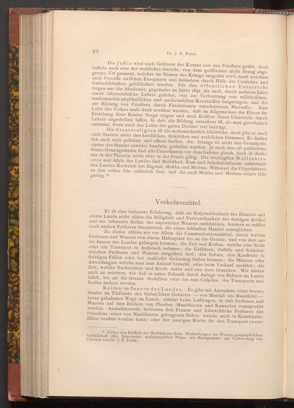 Die Staatsreligion ift die mohamedanifch- fchiitifche, doch gibt es auch viele Suniten unter den kurdifchen, türkifchen und arabifchen Stämmen. Es finden fich auch viele geheime und offene Secten, die, folange fie nicht den Grundprincipien des Staates zuwider handeln, geduldet werden. Ja nach den oft publicirten Staats- Grundgefetzen find alle Unterthanen vor dem Gefetze gleich, doch ift diefes nur in der Theorie, nicht aber in der Praxis giltig. Die wichtigften Wallfahrtsorte und Afyle des Landes find Mefchhed, Kum und Schohabdulazim, aufserhalb des Landes Kerbelah bei Bagdad, Mekka und Medina. Während die Pilgerfahrten zu den erften fehr zahlreich find, find die nach Mekka und Medina relativ fehr gering.*