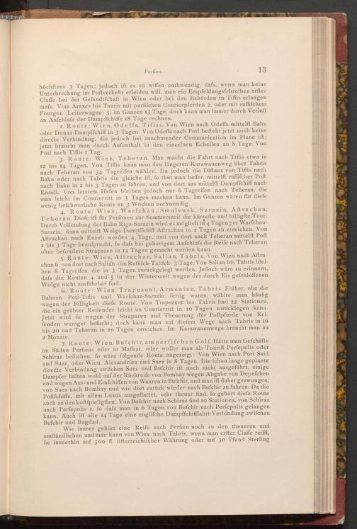3. Route: Wien, Teheran. Man macht die Fahrt nach Tiflis etwa in 12 bis 14 Tagen. Von Tiflis kann man den längeren Karawanenweg über Tabris nach Teheran von 34 Tagreifen wählen. Da jedoch die Diftanz von Tiflis nach Baku oder nach Tabris die gleiche ift, fo thut man beffer, mittelft ruffifcher Poft nach Baku in 2 bis 3 Tagen zu fahren, und von dort aus mittelft Dampffchiff nach Enzeli. Von letztem Hafen bleiben jedoch nur 6 Tagreifen nach Teheran, die man leicht im Courierritt in 3 Tagen machen kann. Im Ganzen wären für diefe wenig befchwerliche Route an 3 Wochen nothwendig.