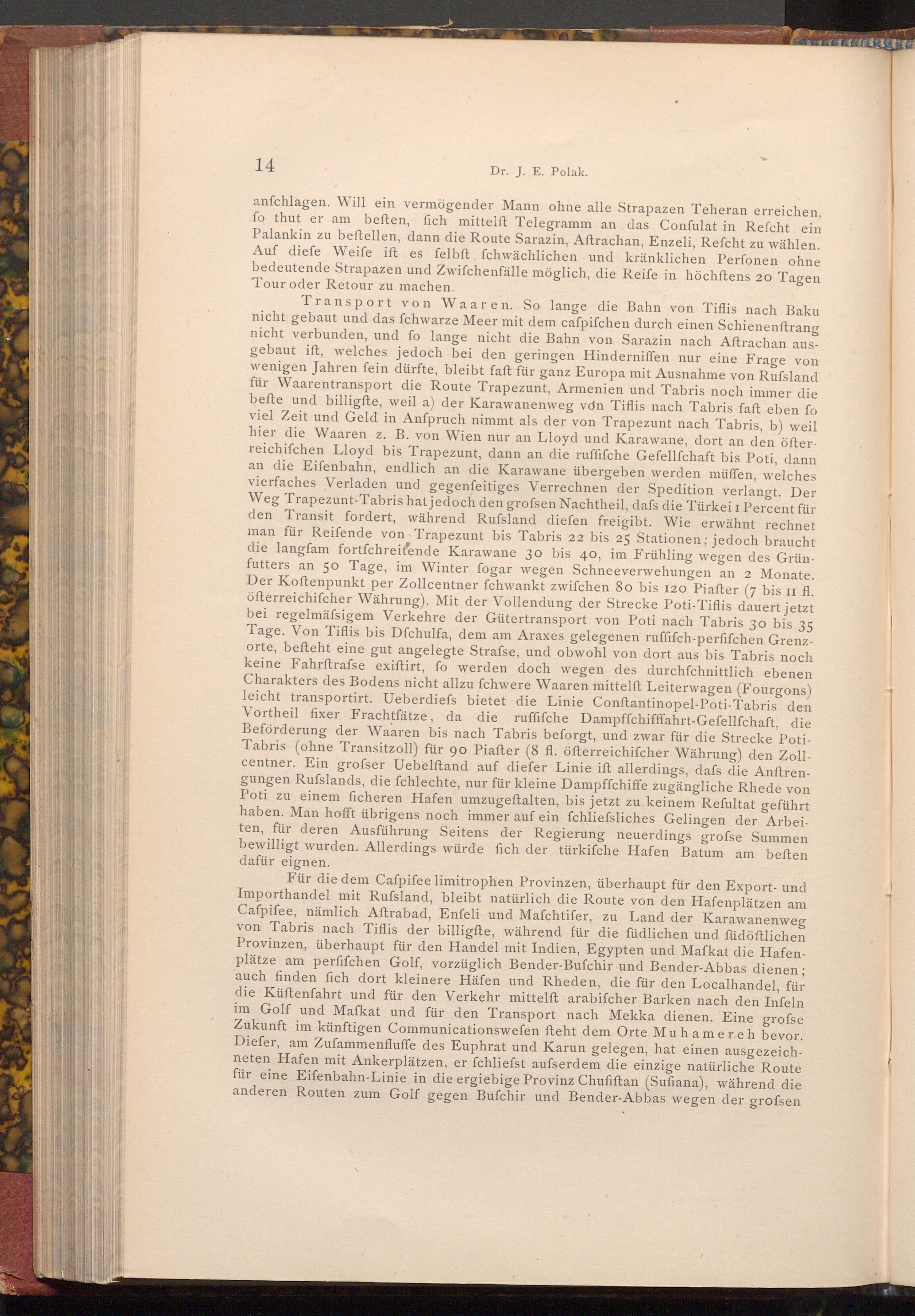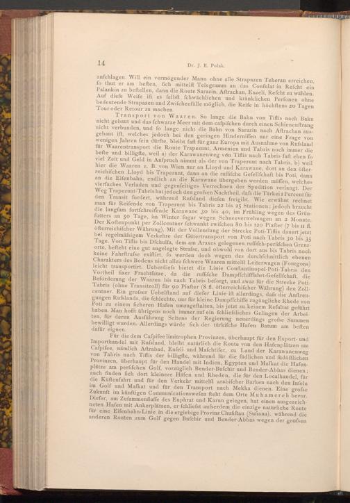 Transport von Waaren. So lange die Bahn von Tiflis nach Baku nicht gebaut und das fchwarze Meer mit dem cafpifchen durch einen Schienenftrang nicht verbunden, und fo lange nicht die Bahn von Sarazin nach Aftrachan ausgebaut ift, welches jedoch bei den geringen Hinderniffen nur eine Frage von wenigen Jahren fein dürfte, bleibt faft für ganz Europa mit Ausnahme von Russland für Waarentransport die Route Trapezunt, Armenien und Tabris noch immer die befte und billigfte, weil a) der Karawanenweg von Tiflis nach Tabris faft eben fo viel Zeit und Geld in Anfpruch nimmt als der von Trapezunt nach Tabris, b) weil hier die Waaren z. B. von Wien nur an Lloyd und Karawane, dort an den öfterreichifchen Lloyd bis Trapezunt, dann an die ruffifche Gefellſchaft bis Poti, dann an die Eifenbahn, endlich an die Karawane übergeben werden müffen, welches vierfaches Verladen und gegenfeitiges Verrechnen der Spedition verlangt. Der Weg Trapezunt- Tabris hat jedoch den grofsen Nachtheil, dafs die Türkei I Percent für den Transit fordert, während Rufsland diefen freigibt. Wie erwähnt rechnet man für Reifende von Trapezunt bis Tabris 22 bis 25 Stationen; jedoch braucht die langfam fortfchreitende Karawane 30 bis 40, im Frühling wegen des Grünfutters an 50 Tage, im Winter fogar wegen Schneeverwehungen an 2 Monate. Der Koftenpunkt per Zollcentner fchwankt zwifchen 80 bis 120 Piafter( 7 bis 11 fl. öfterreichischer Währung). Mit der Vollendung der Strecke Poti- Tiflis dauert jetzt bei regelmäfsigem Verkehre der Gütertransport von Poti nach Tabris 30 bis 35 Tage. Von Tiflis bis Dfchulfa, dem am Araxes gelegenen ruffifch- perfifchen Grenzorte, befteht eine gut angelegte Strafse, und obwohl von dort aus bis Tabris noch keine Fahrftrafse exiftirt, fo werden doch wegen des durchfchnittlich ebenen Charakters des Bodens nicht allzu fchwere Waaren mittelft Leiterwagen( Fourgons) leicht transportirt. Ueberdiefs bietet die Linie Conftantinopel- Poti- Tabris den Vortheil fixer Frachtfätze, da die ruffifche Dampffchifffahrt- Gefellfchaft, die Beförderung der Waaren bis nach Tabris beforgt, und zwar für die Strecke PotiTabris( ohne Transitzoll) für 90 Piafter( 8 fl. öfterreichiſcher Währung) den Zollcentner. Ein grofser Uebelftand auf diefer Linie ift allerdings, dafs die Anftrengungen Rufslands, die fchlechte, nur für kleine Dampffchiffe zugängliche Rhede von Poti zu einem ficheren Hafen umzugeftalten, bis jetzt zu keinem Refultat geführt haben. Man hofft übrigens noch immer auf ein fchliefsliches Gelingen der Arbeiten, für deren Ausführung Seitens der Regierung neuerdings grofse Summen bewilligt wurden. Allerdings würde fich der türkifche Hafen Batum am beften dafür eignen.