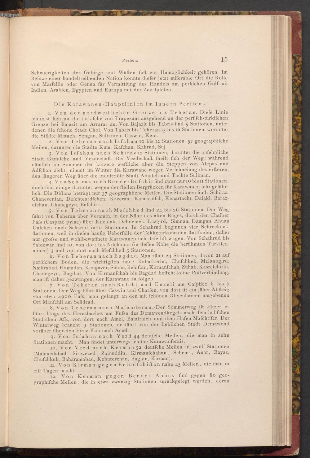 3. Von Isfahan nach Schiraz 12 Stationen, darunter die anfehnliche Stadt Gamifche und Yezdechaft. Bei Yezdechaft theilt fich der Weg; während nämlich im Sommer der kürzere weftliche über die Steppen von Afepas und Adfchan zieht, nimmt im Winter die Karawane wegen Verfchneiung des erfteren, den längeren Weg über die induftriöfe Stadt Abadeh und Tachte Suliman.