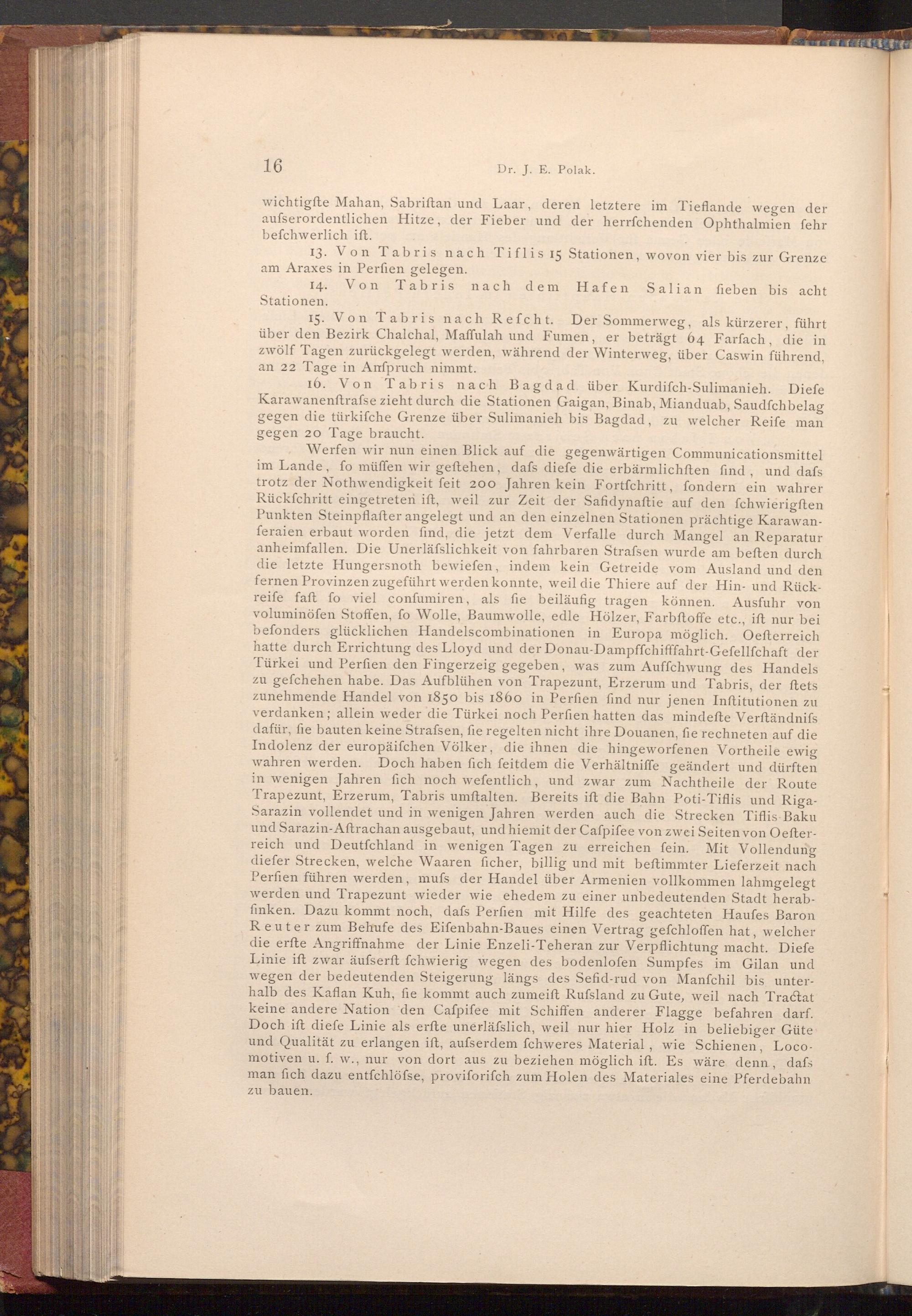 15. Von Tabris nach Refcht. Der Sommerweg, als kürzerer, führt über den Bezirk Chalchal, Maffulah und Fumen, er beträgt 64 Farfach, die in zwölf Tagen zurückgelegt werden, während der Winterweg, über Caswin führend, an 22 Tage in Anspruch nimmt.