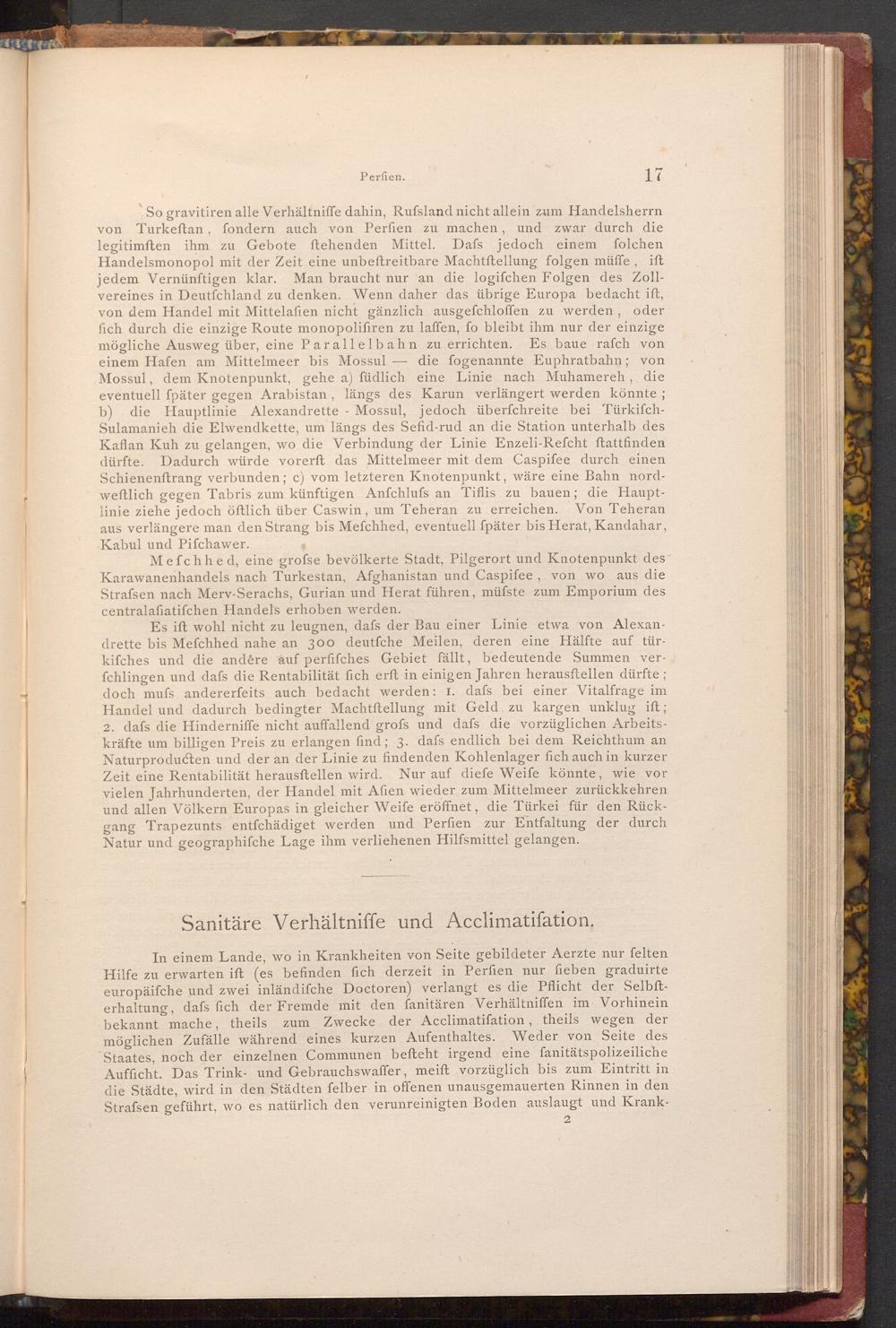 Es ist wohl nicht zu leugnen, dafs der Bau einer Linie etwa von Alexandrette bis Mefchhed nahe an 300 deutfche Meilen, deren eine Hälfte auf türkifches und die andere auf perfifches Gebiet fällt, bedeutende Summen verfchlingen und dafs die Rentabilität fich erft in einigen Jahren herausftellen dürfte; doch mufs andererfeits auch bedacht werden: 1. dafs bei einer Vitalfrage im Handel und dadurch bedingter Machtftellung mit Geld zu kargen unklug ift; 2. dafs die Hinderniffe nicht auffallend grofs und dafs die vorzüglichen Arbeitskräfte um billigen Preis zu erlangen find; 3. dafs endlich bei dem Reichthum an Naturproducten und der an der Linie zu findenden Kohlenlager fich auch in kurzer Zeit eine Rentabilität herausftellen wird. Nur auf diefe Weife könnte, wie vor vielen Jahrhunderten, der Handel mit Afien wieder zum Mittelmeer zurückkehren und allen Völkern Europas in gleicher Weife eröffnet, die Türkei für den Rückgang Trapezunts entfchädiget werden und Perfien zur Entfaltung der durch Natur und geographifche Lage ihm verliehenen Hilfsmittel gelangen.