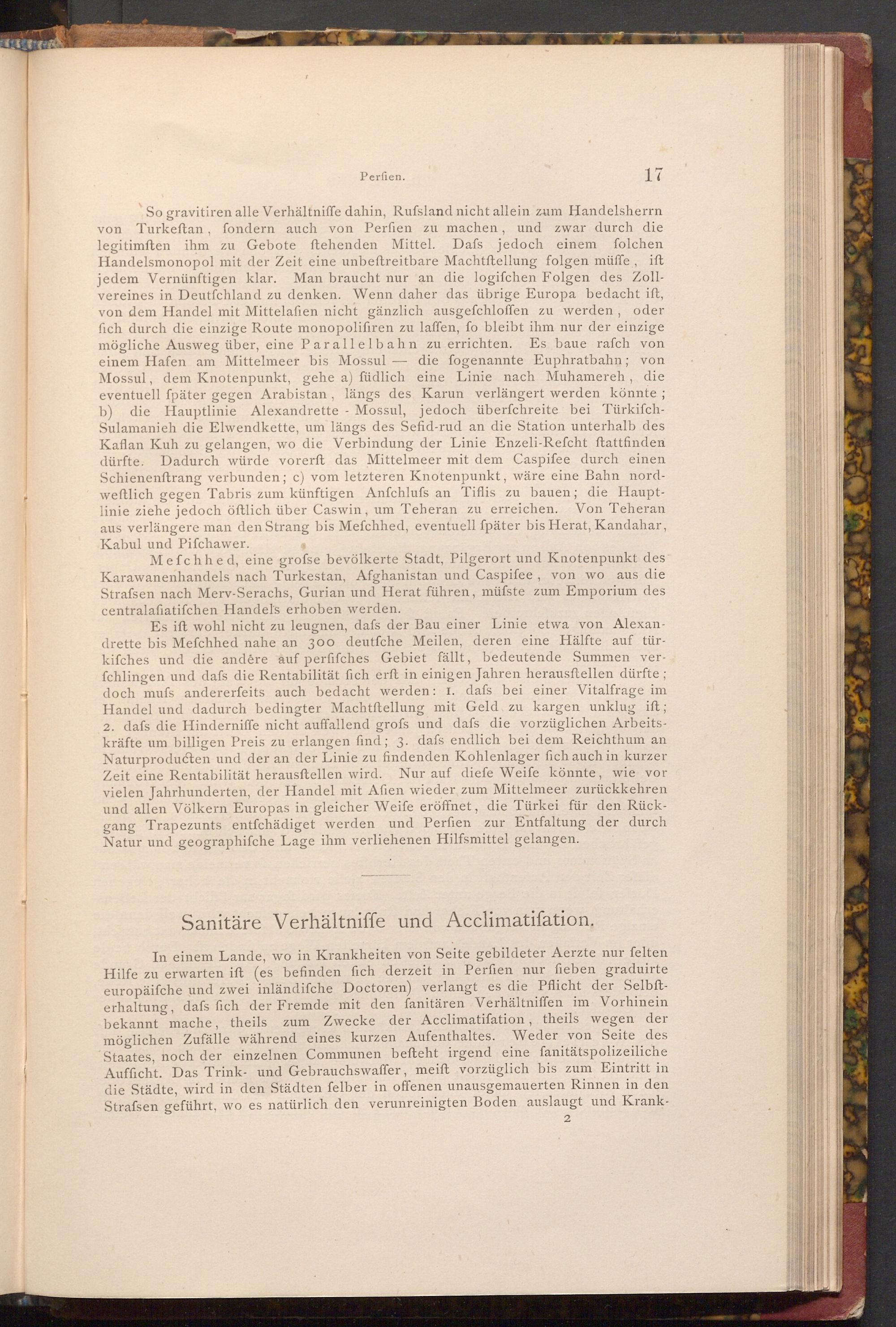 Mefchhed, eine grofse bevölkerte Stadt, Pilgerort und Knotenpunkt des Karawanenhandels nach Turkestan, Afghanistan und Caspifee, von wo aus die Strafsen nach Merv- Serachs, Gurian und Herat führen, müfste zum Emporium des centralafiatifchen Handels erhoben werden.