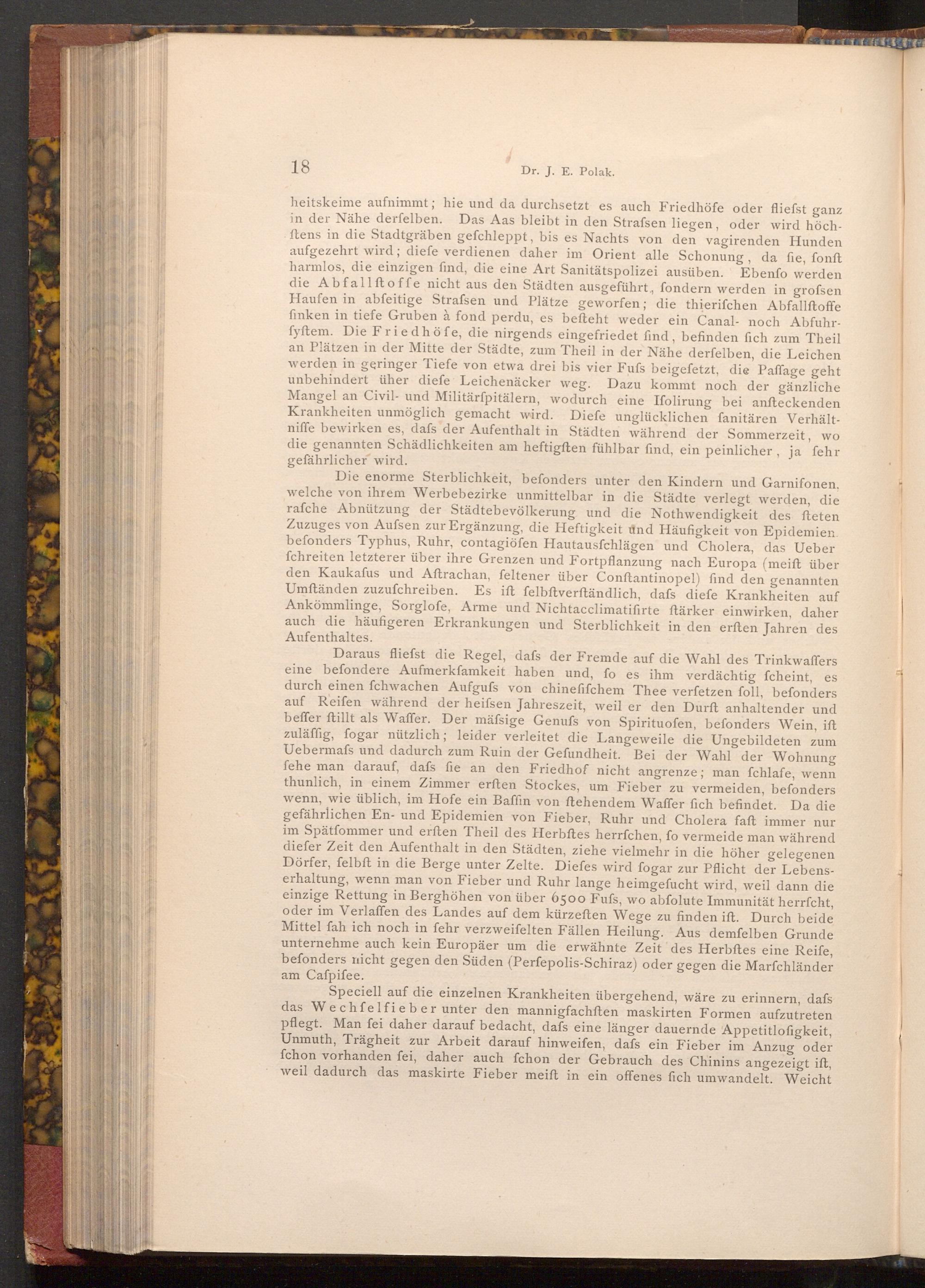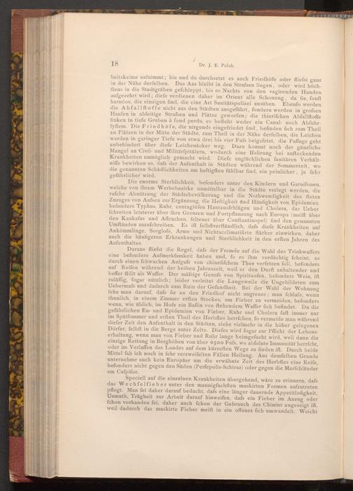 Daraus fliefst die Regel, dafs der Fremde auf die Wahl des Trinkwaffers eine befondere Aufmerkſamkeit haben und, fo es ihm verdächtig fcheint, es durch einen fchwachen Aufgufs von chine fifchem Thee verfetzen foll, befonders auf Reifen während der heifsen Jahreszeit, weil er den Durft anhaltender und beffer ftillt als Waffer. Der mässige Genufs von Spirituofen, befonders Wein, ift zuläffig, fogar nützlich; leider verleitet die Langeweile die Ungebildeten zum Uebermafs und dadurch zum Ruin der Gefundheit. Bei der Wahl der Wohnung fehe man darauf, dafs fie an den Friedhof nicht angrenze; man fchlafe, wenn thunlich, in einem Zimmer erften Stockes, um Fieber zu vermeiden, befonders wenn, wie üblich, im Hofe ein Baffin von ftehendem Waffer fich befindet. Da die gefährlichen En- und Epidemien von Fieber, Ruhr und Cholera faft immer nur im Spätfommer und erften Theil des Herbftes herrfchen, fo vermeide man während diefer Zeit den Aufenthalt in den Städten, ziehe vielmehr in die höher gelegenen Dörfer, felbft in die Berge unter Zelte. Diefes wird fogar zur Pflicht der Lebenserhaltung, wenn man von Fieber und Ruhr lange heimgefucht wird, weil dann die einzige Rettung in Berghöhen von über 6500 Fufs, wo abfolute Immunität herrfcht, oder im Verlaffen des Landes auf dem kürzeften Wege zu finden ift. Durch beide Mittel fah ich noch in fehr verzweifelten Fällen Heilung. Aus demfelben Grunde unternehme auch kein Europäer um die erwähnte Zeit des Herbftes eine Reife, befonders nicht gegen den Süden( Perfepolis- Schiraz) oder gegen die Marfchländer am Cafpifee.