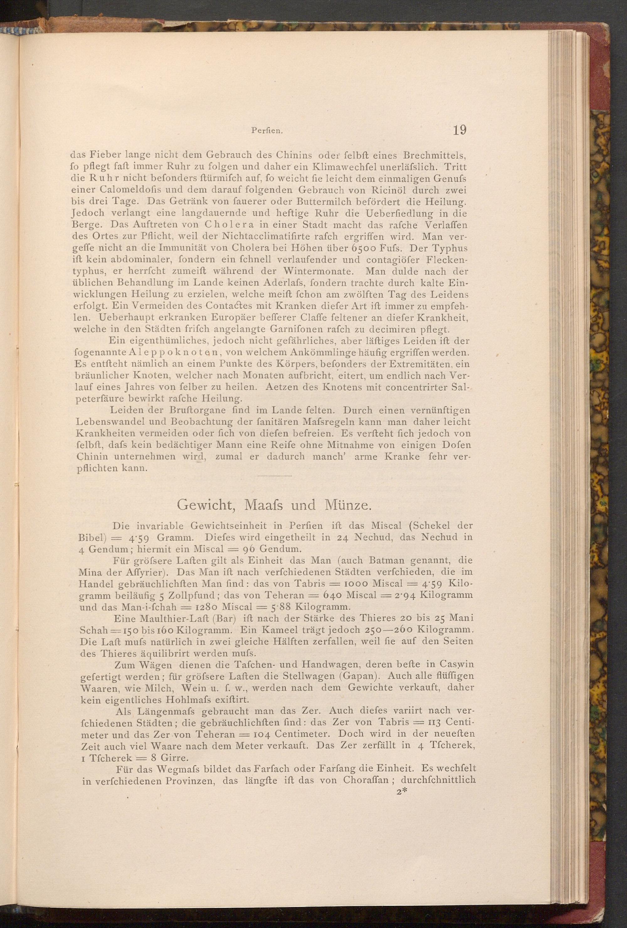 Als Längenmafs gebraucht man das Zer. Auch diefes variirt nach verfchiedenen Städten; die gebräuchlichften find: das Zer von Tabris 113 Centimeter und das Zer von Teheran 104 Centimeter. Doch wird in der neueften Zeit auch viel Waare nach dem Meter verkauft. Das Zer zerfällt in 4 Tfcherek, I Tfcherek= 8 Girre.