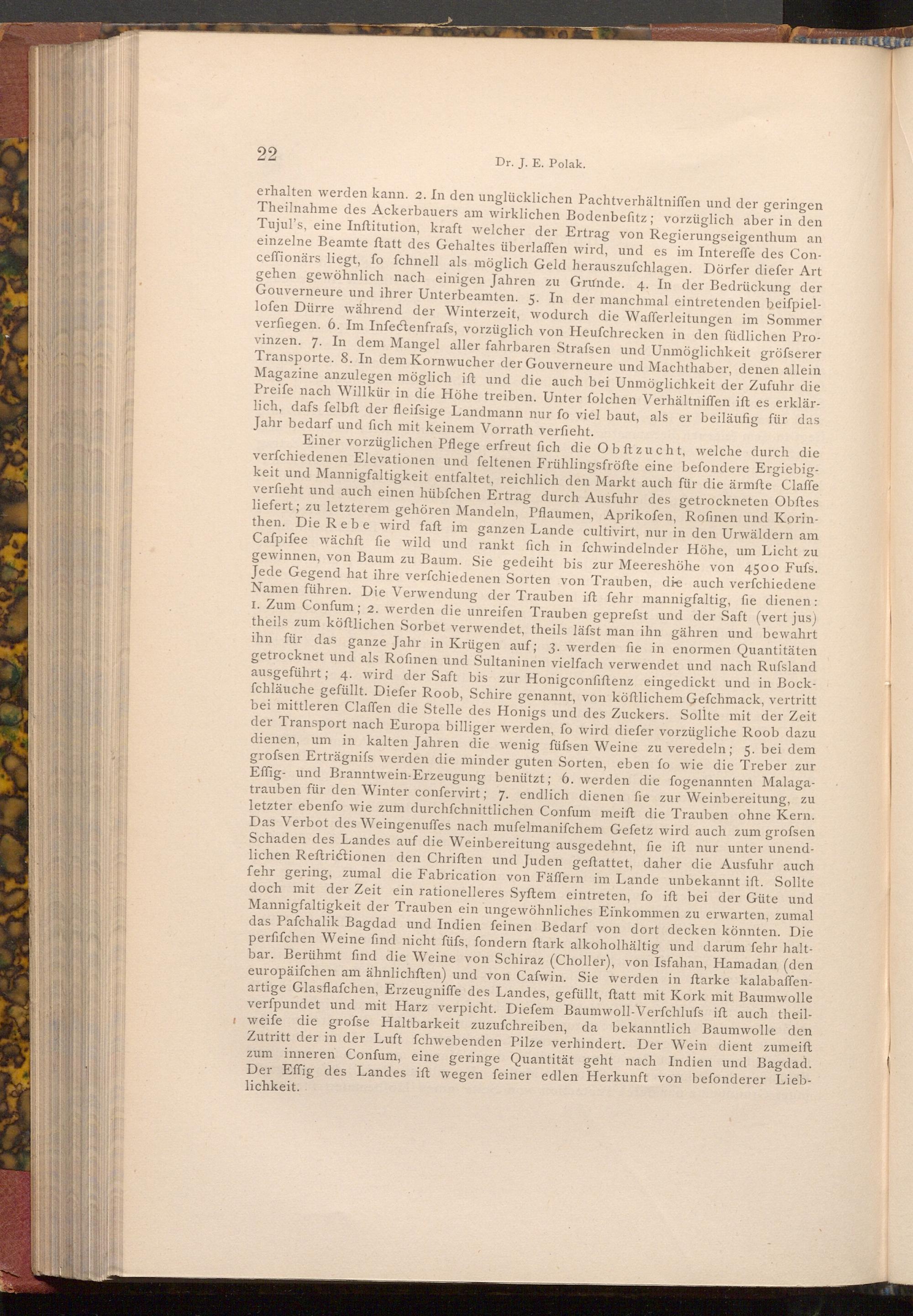 Einer vorzüglichen Pflege erfreut fich die Obftzucht, welche durch die verfchiedenen Elevationen und feltenen Frühlingsfröfte eine befondere Ergiebigkeit und Mannigfaltigkeit entfaltet, reichlich den Markt auch für die ärmfte Claffe verfieht und auch einen hübfchen Ertrag durch Ausfuhr des getrockneten Obftes liefert; zu letzterem gehören Mandeln, Pflaumen, Aprikofen, Rofinen und Korinthen. Die Rebe wird faft im ganzen Lande cultivirt, nur in den Urwäldern am Cafpifee wächft fie wild und rankt fich in fchwindelnder Höhe, um Licht zu gewinnen, von Baum zu Baum. Sie gedeiht bis zur Meereshöhe von 4500 Fufs. Jede Gegend hat ihre verfchiedenen Sorten von Trauben, die auch verfchiedene Namen führen. Die Verwendung der Trauben ift fehr mannigfaltig, fie dienen: I. Zum Confum; 2. werden die unreifen Trauben geprefst und der Saft( vert jus) theils zum köftlichen Sorbet verwendet, theils läfst man ihn gähren und bewahrt ihn für das ganze Jahr in Krügen auf; 3. werden fie in enormen Quantitäten getrocknet und als Rofinen und Sultaninen vielfach verwendet und nach Rufsland ausgeführt; 4. wird der Saft bis zur Honig confiftenz eingedickt und in Bockfchläuche gefüllt. Diefer Roob, Schire genannt, von köftlichem Gefchmack, vertritt bei mittleren Claffen die Stelle des Honigs und des Zuckers. Sollte mit der Zeit der Transport nach Europa billiger werden, fo wird diefer vorzügliche Roob dazu dienen, um in kalten Jahren die wenig füfsen Weine zu veredeln; 5. bei dem grofsen Erträgnifs werden die minder guten Sorten, eben fo wie die Treber zur Effig- und Branntwein- Erzeugung benützt; 6. werden die fogenannten Malagatrauben für den Winter confervirt; 7. endlich dienen fie zur Weinbereitung, zu letzter ebenfo wie zum durchfchnittlichen Confum meift die Trauben ohne Kern. Das Verbot des Weingenuffes nach mufelmanifchem Gefetz wird auch zum grofsen Schaden des Landes auf die Weinbereitung ausgedehnt, fie ift nur unter unendlichen Reſtrictionen den Chriften und Juden geftattet, daher die Ausfuhr auch fehr gering, zumal die Fabrication von Fäffern im Lande unbekannt ift. Sollte doch mit der Zeit ein rationelleres Syftem eintreten, fo ift bei der Güte und Mannigfaltigkeit der Trauben ein ungewöhnliches Einkommen zu erwarten, zumal das Pafchalik Bagdad und Indien feinen Bedarf von dort decken könnten. Die perfifchen Weine find nicht füfs, fondern ftark alkoholhältig und darum fehr haltbar. Berühmt find die Weine von Schiraz( Choller), von Isfahan, Hamadan( den europäiſchen am ähnlichften) und von Cafwin. Sie werden in ftarke kalabaffenartige Glasflafchen, Erzeugniffe des Landes, gefüllt, ftatt mit Kork mit Baumwolle verfpundet und mit Harz verpicht. Diefem Baumwoll- Verfchlufs ift auch theilweife die grofse Haltbarkeit zuzufchreiben, da bekanntlich Baumwolle den Zutritt der in der Luft fchwebenden Pilze verhindert. Der Wein dient zumeift zum inneren Confum, eine geringe Quantität geht nach Indien und Bagdad. Der Effig des Landes ift wegen feiner edlen Herkunft von befonderer Lieblichkeit.