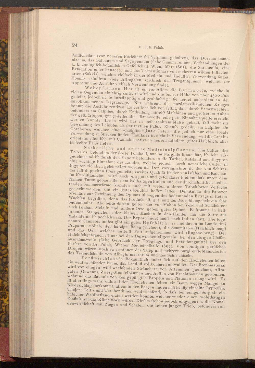 Webepflanzen. Hier ift es vor Allem die Baumwolle, welche in vielen Gegenden einjährig cultivirt wird und die bis zur Höhe von über 4500 Fufs gedeiht, jedoch ift fie kurzftapplig und grobfaferig; fie leidet aufserdem an der unvollkommenen Degrainage. Nur während des nordamerikanifchen Krieges konnte die Ausfuhr rentiren. Es verfteht fich von felbft, dafs durch Samenwechfel, befonders am Cafpifee, durch Enthülfung mittelft Maſchinen und gröfserem Anbau der gelbfärbigen, gut gedeihenden Baumwolle eine gute Einnahmsquelle erreicht werden könnte. Lein wird nur in befchränktem Mafse gebaut, faft mehr zur Gewinnung des Leinöles als der textilen Fafer. Ebenfo gedeiht am Cafpifee ein Corchorus, welcher eine vorzügliche Jute liefert, die jedoch nur eine locale Verwendung zu Stricken findet. Hanffafer ift nicht in Verwendung, weil die Canabis orientalis identifch mit Cannabis sativa in heifsen Ländern, gutes Hafchifch, aber fchlechte Fafer liefert.