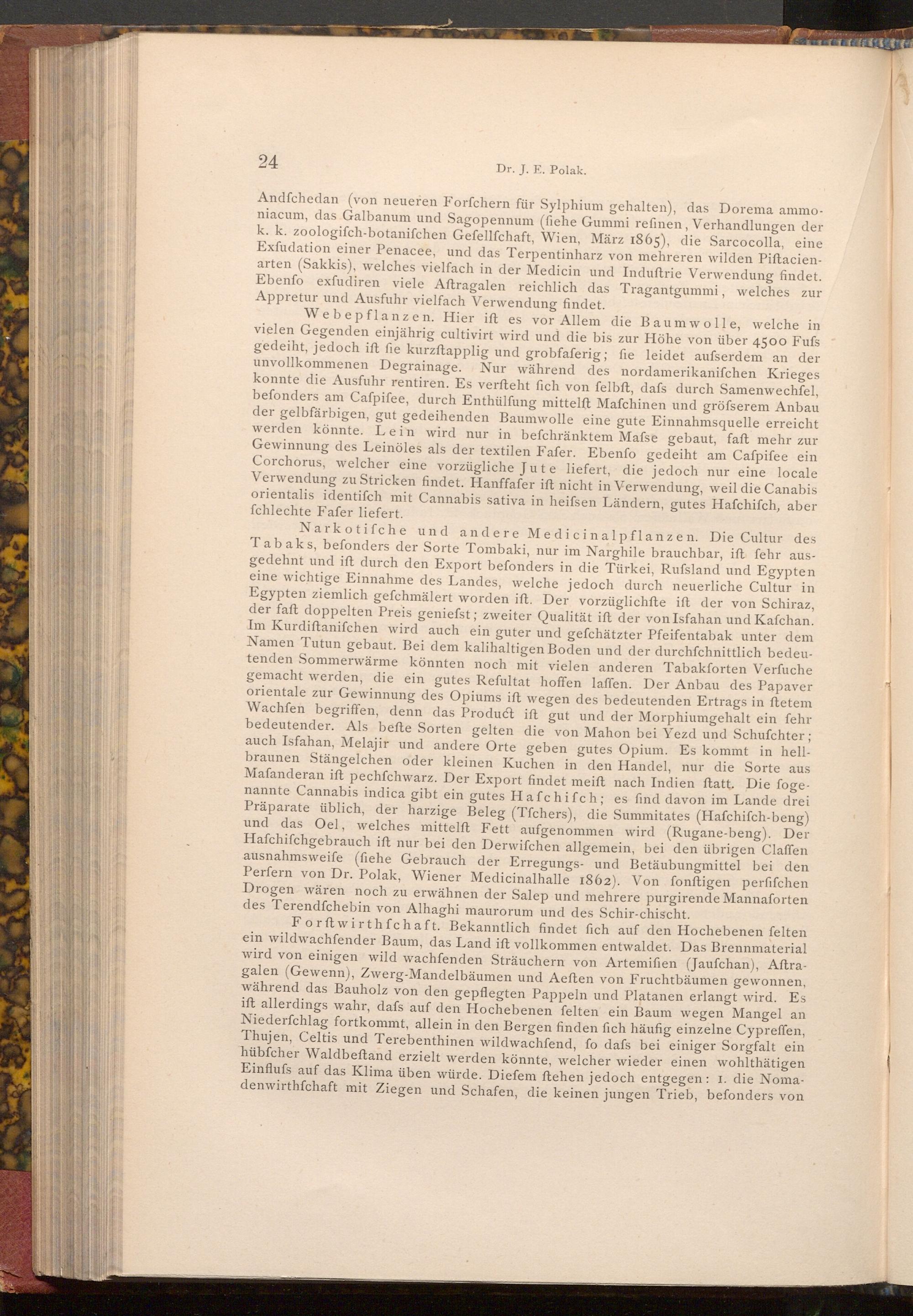 Narkotifche und andere Medicinalpflanzen. Die Cultur des Tabaks, befonders der Sorte Tombaki, nur im Narghile brauchbar, ift fehr ausgedehnt und ift durch den Export befonders in die Türkei, Rufsland und Egypten eine wichtige Einnahme des Landes, welche jedoch durch neuerliche Cultur in Egypten ziemlich gefchmälert worden ift. Der vorzüglichfte ift der von Schiraz, der faft doppelten Preis geniefst; zweiter Qualität ift der von Isfahan und Kafchan. Im Kurdiftanifchen wird auch ein guter und gefchätzter Pfeifentabak unter dem Namen Tutun gebaut. Bei dem kalihaltigen Boden und der durchſchnittlich bedeutenden Sommerwärme könnten noch mit vielen anderen Tabakforten Verfuche gemacht werden, die ein gutes Refultat hoffen laffen. Der Anbau des Papaver orientale zur Gewinnung des Opiums ift wegen des bedeutenden Ertrags in ftetem Wachfen begriffen, denn das Product ift gut und der Morphiumgehalt ein fehr bedeutender. Als befte Sorten gelten die von Mahon bei Yezd und Schufchter; auch Isfahan, Melajir und andere Orte geben gutes Opium. Es kommt in hellbraunen Stängelchen oder kleinen Kuchen in den Handel, nur die Sorte aus Mafanderan ift pechfchwarz. Der Export findet meift nach Indien ftatt. Die fogenannte Cannabis indica gibt ein gutes Hafchifch; es find davon im Lande drei Präparate üblich, der harzige Beleg( Tfchers), die Summitates( Hafchiſch- beng) und das Oel, welches mittelft Fett aufgenommen wird( Rugane- beng). Der Hafchifchgebrauch ift nur bei den Derwifchen allgemein, bei den übrigen Claffen ausnahmsweife( fiehe Gebrauch der Erregungs- und Betäubungmittel bei den Perfern von Dr. Polak, Wiener Medicinalhalle 1862). Von fonftigen perfifchen Drogen wären noch zu erwähnen der Salep und mehrere purgirende Mannaforten des Terendfchebin von Alhaghi maurorum und des Schir- chischt.
