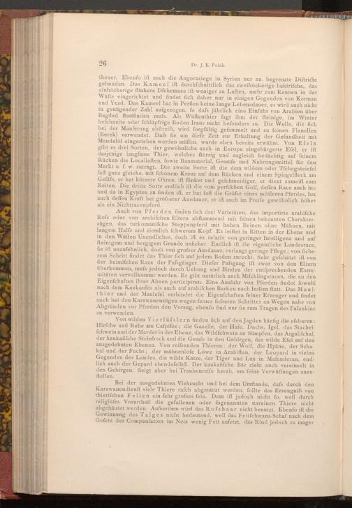 theuer. Ebenfo ift auch die Angoraziege in Syrien nur an begrenzte Diſtricte gebunden. Das Kameel ift durchſchnittlich das zweihöckerige baktriſche, das einhöckerige flinkere Dfchemaze ift weniger zu Laften, mehr zum Rennen in der Wüfte eingerichtet und findet fich daher nur in einigen Gegenden von Kerman und Yezd. Das Kameel hat in Perfien keine lange Lebensdauer, es wird auch nicht in genügender Zahl aufgezogen, fo dafs jährlich eine Einfuhr von Arabien über Bagdad ftattfinden mufs. Als Wüftenthier fagt ihm der fteinige, im Winter befchneite oder fchlüpfrige Boden Irans nicht befonders zu. Die Wolle, die fich bei der Mauferung abftreift, wird forgfältig gefammelt und zu feinen Flanellen ( Berek) verwendet. Dafs fie um diefe Zeit zur Erhaltung der Gefundheit mit Mandelöl eingerieben werden müffen, wurde oben bereits erwähnt. Von Efeln gibt es drei Sorten, der gewöhnliche auch in Europa eingebürgerte Efel, er ift dasjenige langfame Thier, welches ftörrig und zugleich bedächtig auf feinem Rücken die Locallaften, fowie Baumaterial, Gemüfe und Nahrungsmittel für den Markt u. f. w. zuträgt. Die zweite Sorte ift die dem wildem oder Tfchagateiefel faft ganz gleiche, mit fchönem Kreuz auf dem Rücken und einem Spiegelfleck am Gefäfs, er hat kürzere Ohren, ift flinker und gefchmeidiger, er dient zumeift zum Reiten. Die dritte Sorte endlich ift die vom perfifchen Golf, deffen Race auch hie und da in Egypten zu finden ift, er hat faft die Gröfse eines mittleren Pferdes, hat auch deffen Kraft bei gröfserer Ausdauer, er ift auch im Preife gewöhnlich höher als ein Nichtracenpferd.