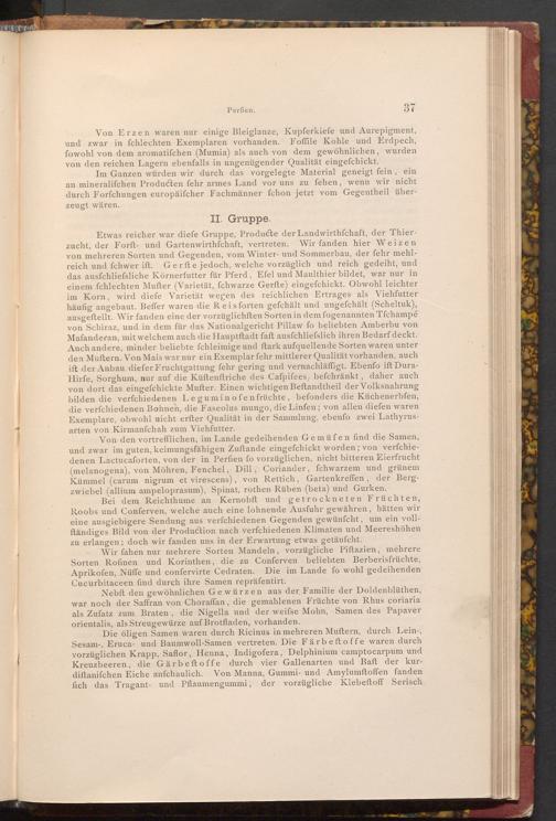 Etwas reicher war diefe Gruppe, Producte der Landwirthschaft, der Thier zucht, der Forft- und Gartenwirthfchaft, vertreten. Wir fanden hier Weizen von mehreren Sorten und Gegenden, vom Winter- und Sommerbau, der fehr mehlreich und fchwer ift. Gerfte jedoch, welche vorzüglich und reich gedeiht, und das ausfchliefsliche Körnerfutter für Pferd, Efel und Maulthier bildet, war nur in einem fchlechten Mufter( Varietät, fchwarze Gerfte) eingefchickt. Obwohl leichter im Korn, wird diefe Varietät wegen des reichlichen Ertrages als Viehfutter häufig angebaut. Beffer waren die Reis forten gefchält und ungefchält( Scheltuk), ausgeftellt. Wir fanden eine der vorzüglichften Sorten in dem fogenannten Tfchampé von Schiraz, und in dem für das Nationalgericht Pillaw fo beliebten Amberbu von Mafanderan, mit welchem auch die Hauptftadt faft ausfchliefslich ihren Bedarf deckt. Auch andere, minder beliebte fchleimige und ftark aufquellende Sorten waren unter den Muftern. Von Mais war nur ein Exemplar fehr mittlerer Qualität vorhanden, auch ift der Anbau diefer Fruchtgattung fehr gering und vernachläffigt. Ebenfo ift DuraHirfe, Sorghum, nur auf die Küftenftriche des Cafpifees, befchränkt, daher auch von dort das eingefchickte Mufter. Einen wichtigen Beftandtheil der Volksnahrung bilden die verfchiedenen Leguminofen früchte, befonders die Küchenerbfen, die verfchiedenen Bohnen, die Faseolus mungo, die Linfen; von allen diefen waren Exemplare, obwohl nicht erfter Qualität in der Sammlung, ebenfo zwei Lathyrusarten von Kirmanfchah zum Viehfutter.