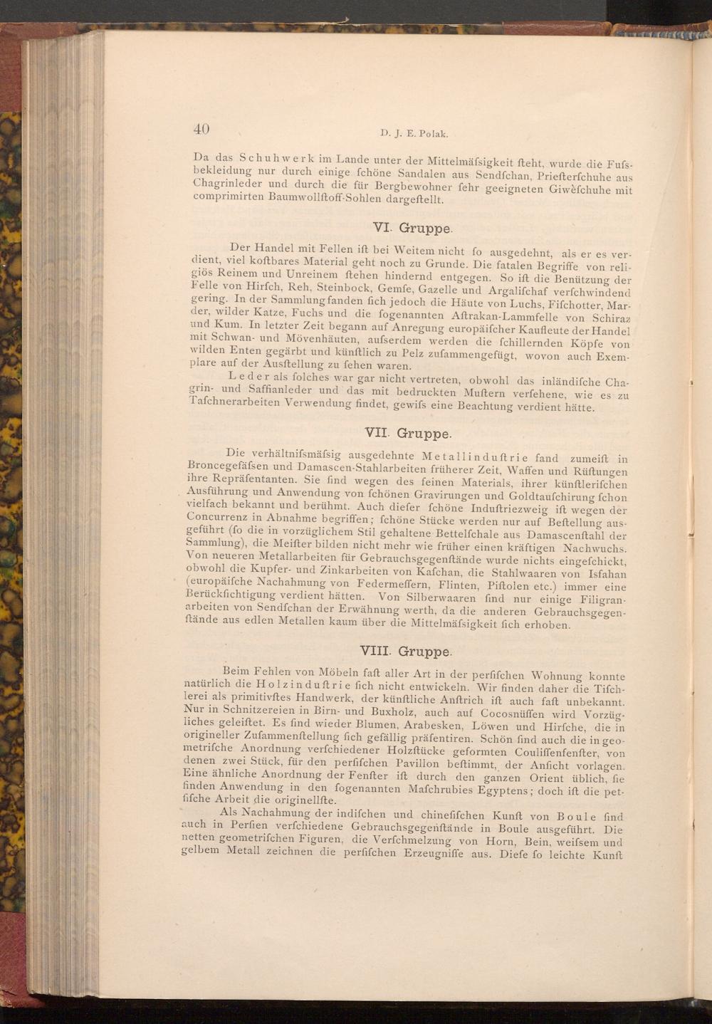 Der Handel mit Fellen ift bei Weitem nicht fo ausgedehnt, als er es verdient, viel koftbares Material geht noch zu Grunde. Die fatalen Begriffe von religiös Reinem und Unreinem ftehen hindernd entgegen. So ift die Benützung der Felle von Hirfch, Reh, Steinbock, Gemfe, Gazelle und Argalifchaf verfchwindend gering. In der Sammlung fanden fich jedoch die Häute von Luchs, Fifchotter, Marder, wilder Katze, Fuchs und die fogenannten Aftrakan- Lammfelle von Schiraz und Kum. In letzter Zeit begann auf Anregung europäiſcher Kaufleute der Handel mit Schwan- und Mövenhäuten, aufserdem werden die fchillernden Köpfe von wilden Enten gegärbt und künftlich zu Pelz zufammengefügt, wovon auch Exemplare auf der Ausftellung zu fehen waren.