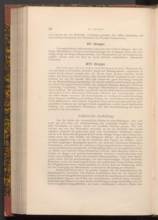Erziehungs-, Unterrichts- und Bildungswefen. Wenn jede Nation das Befte an Producten, Induſtrie, Kunft und Bildungsmitteln eingefendet, fo mufste Perfien darauf bedacht fein, die Werke feiner grofsen Autoren, die für immer den Stolz des Landes bilden, feine fchönfte Blüthe repräfentiren und deren Studium bis auf die neuefte Zeit den Grund der guten Erziehung ausmacht, für die Weltausftellung einzufchicken. Es wurden nebftbei auch Exemplare gewählt, die durch die ausgezeichnete Schrift, den eleganten Einband, Rand und Titelblatt, Verzierung, Vergoldung, Papier, eingelegte Miniaturbilder und Einrahmung als Unica daftehen. Mit Ausnahme von Ferdufi und den Hiftorikern waren didaktifche und epifche Poefie, Mathematik, Philofophie, Medicin und Lexikographie durch die beften Mufter vertreten. Die Schreibekunft, als wichtiger Zweig der Erziehung, deren elegante Ausführung die fleifsige Uebung von vielen Jahren erfordert, wurde durch Mufterblätter erfter Meifter dargestellt. Unter Anderem waren auch vier kalligraphifche Tableaux mit blumiger Schrift eingefchickt, welche durch künftlerifche Stellung der orientalifchen Buchstaben und ihrer Ausfchmückung mit Blumengewinden fich hervorthaten.