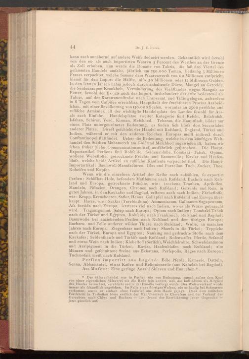 kann auch annähernd auf andere Weife deducirt werden. Bekanntlich wird fowohl von den ex- als auch importirten Waaren 5 Percent des Werthes an der Grenze als Zoll erhoben, nun wurde die Douane von Tabris, die faft drei Viertel des gefammten Handels umfafst, jährlich um 250.000 Toman, beiläufig 3 Millionen Francs verpachtet, welche Summe dem Waarenwerth von 60 Millionen entspricht, hiemit für den Import die Hälfte, alfo 30 Millionen oder 12 Millionen Gulden. In den letzten Jahren nahm jedoch durch anhaltende Dürre, Mangel an Getreide, die Seidenraupen- Krankheit, Verminderung des Viehftandes wegen Mangels an Futter, fowohl der Ex- als auch der Import, insbefondere der erfte bedeutend ab. Tabris, auf der Karawanenftrafse nach Trapezunt und Tiflis gelegen, aufserdem in 8 Tagen vom Cafpifee erreichbar, Hauptftadt der fruchtbaren Provinz Azabeidfchan, mit einer Bevölkerung von 150.000 Seelen, worunter an 2500 perfifche und ruffifche Armenier, ift der wichtigfte Handelsplatz des Landes fowohl für Ausals auch Einfuhr. Handelsplätze zweiter Kategorie find Refcht, Belafrufch, Isfahan, Schiraz, Yezd, Kirman, Mefchhed. Teheran, die Hauptftadt, bildet nur einen Platz untergeordneter Bedeutung, es finden fich blofs dort Succurfalen anderer Plätze. Direct gefchieht der Handel mit Rufsland, England, Türkei und Indien, während er mit den anderen Reichen Europas meift indirect durch Conftantinopel ftattfindet. Ueber die Bedeutung, welche in dem künftigen Welthandel den Städten Muhamereh am Golf und Mefchhed zugewiefen ift, haben wir fchon früher( fiehe Communicationsmittel) ausführlich gefprochen. Die HauptExportartikel Perfiens find Rohfeide, Seidenabfälle, Tombaki Tabak, Opium, wollene Webeftoffe, getrocknete Früchte und Baumwolle; Kaviar und Haufenblafe, welche beide Artikel an ruffifche Kaufleute verpachtet find. Die HauptImportartikel: Baumwoll- Manufacturen, Glas und Porzellan, Tuch, Zucker, Thee, Roheifen und Kupfer.