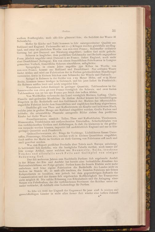 Der feit mehreren Jahren zum Nachtheile Perfiens fich ergebende Ausfall in der Bilanz der Ein- und Ausfuhr hat bereits eine bedenkliche Abnahme des Nationalreichthums zur Folge gebabt. Perfien kann die fremde Einfuhr nicht mehr entbehren, weil feine eigene Fabrication die Bedürfniffe des Landes nicht zu decken im Stande ift; es mufs alfo trachten, die fremden Fabricate mit feinen Rohproducten zu bezahlen, was jedoch bei dem gegenwärtigen Zuftande der Communication und der daraus fich ergebenden Koftfpieligkeit des Transportes nicht möglich ift. Die rafche Erbauung von Eifenbahnen und die Anlegung eines Netzes von Fahrftrafsen, das die verfchiedenen Provinzen des Reiches unter einander verbindet, ift defshalb eine Lebensfrage für Perfien.