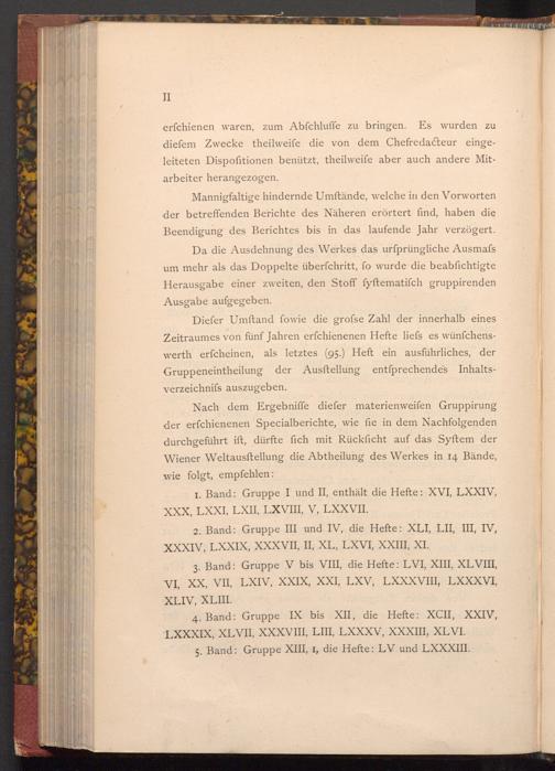 Nach dem Ergebniffe diefer materienweifen Gruppirung der erfchienenen Specialberichte, wie fie in dem Nachfolgenden durchgeführt ift, dürfte fich mit Rückſicht auf das Syftem der Wiener Weltausftellung die Abtheilung des Werkes in 14 Bände, wie folgt, empfehlen: