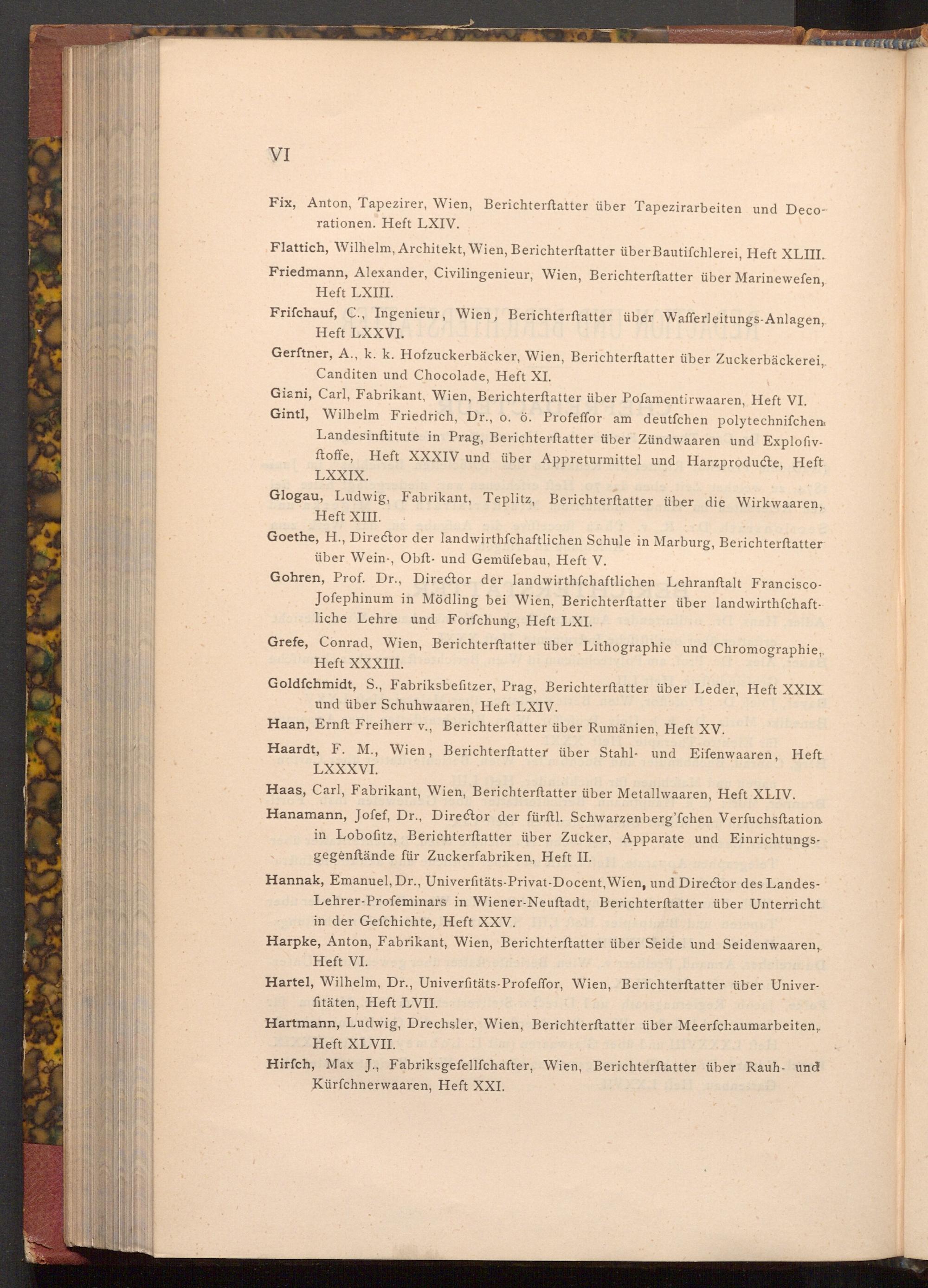 Haas, Carl, Fabrikant, Wien, Berichterftatter über Metallwaaren, Heft XLIV. Hanamann, Jofef, Dr., Director der fürftl. Schwarzenberg'fchen Verfuchsftation in Lobofitz, Berichterftatter über Zucker, Apparate und Einrichtungsgegenstände für Zuckerfabriken, Heft II.