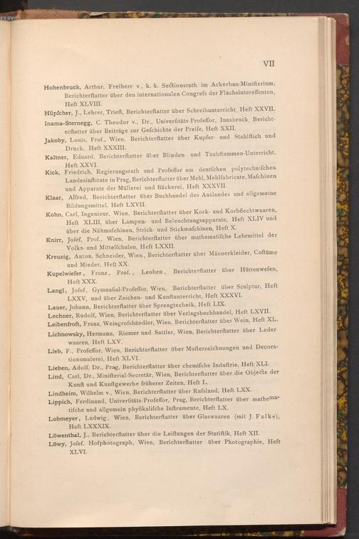 Lechner, Rudolf, Wien, Berichterstatter über Verlagsbuchhandel, Heft LXVII. Leibenfroft, Franz, Weingrofshändler, Wien, Berichterstatter über Wein, Heft XL. Lichnowsky, Hermann, Riemer und Sattler, Wien, Berichterstatter über Lederwaaren, Heft LXV.