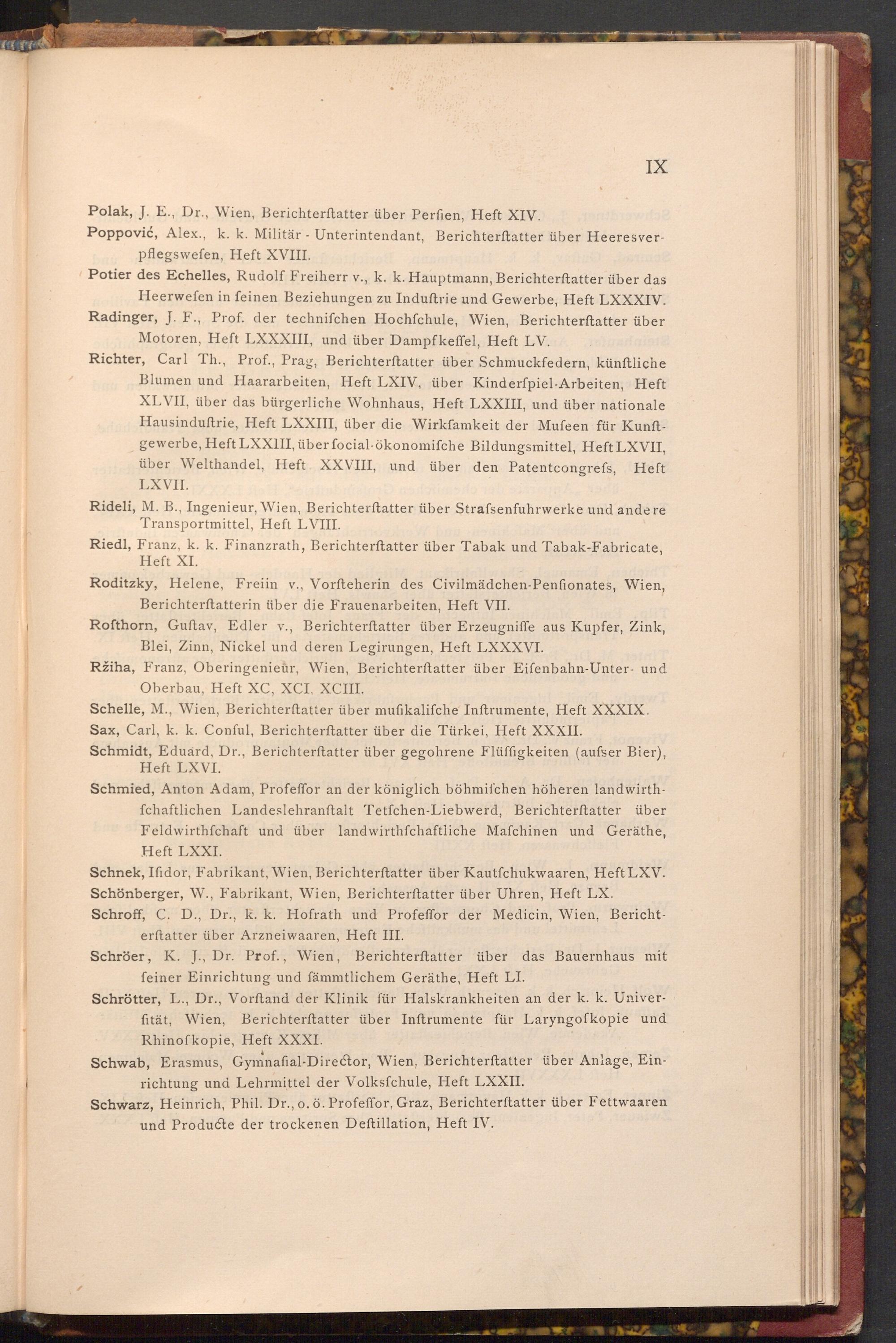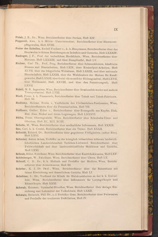 Potier des Echelles, Rudolf Freiherr v., k. k. Hauptmann, Berichterstatter über das Heerwefen in feinen Beziehungen zu Induftrie und Gewerbe, Heft LXXXIV. Radinger, J. F., Prof. der technifchen Hochfchule, Wien, Berichterstatter über Motoren, Heft LXXXIII, und über Dampfkeffel, Heft LV. Richter, Carl Th., Prof., Prag, Berichterstatter über Schmuckfedern, künftliche Blumen und Haararbeiten, Heft LXIV, über Kinderfpiel- Arbeiten, Heft XLVII, über das bürgerliche Wohnhaus, Heft LXXIII, und über nationale. Hausinduftrie, Heft LXXIII, über die Wirkfamkeit der Mufeen für Kunftgewerbe, Heft LXXIII, über focial- ökonomifche Bildungsmittel, Heft LXVII, über Welthandel, Heft XXVIII, und über den Patentcongrefs, Heft LXVII.