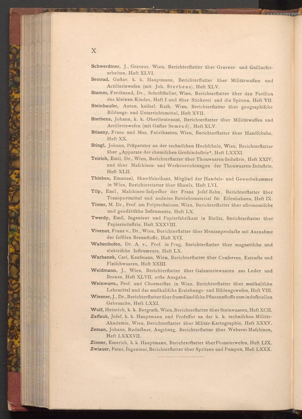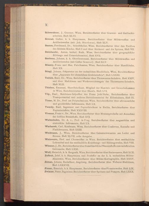 Wolf, Heinrich, k. k. Bergrath, Wien, Berichterstatter über Steinwaaren, Heft XCII. Zaffauk, Jofef, k. k. Hauptmann und Profeffor an der k. k. technifchen MilitärAkademie, Wien, Berichterstatter über Militär- Kartographie, Heft XXXV. Zeman, Johann, Redacteur, Augsburg, Berichterftatter über Weberei- Mafchinen, Heft LXXXVII.