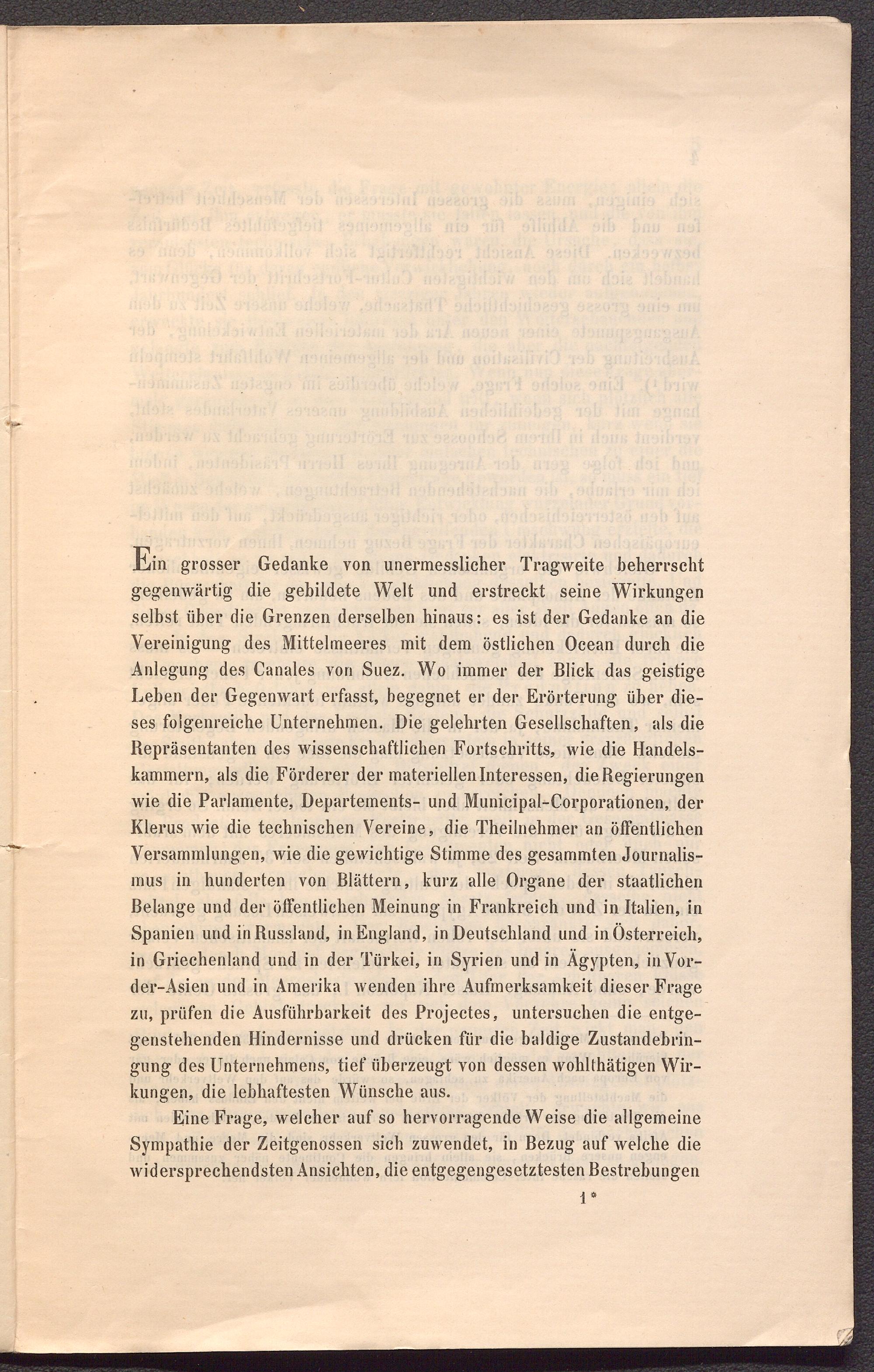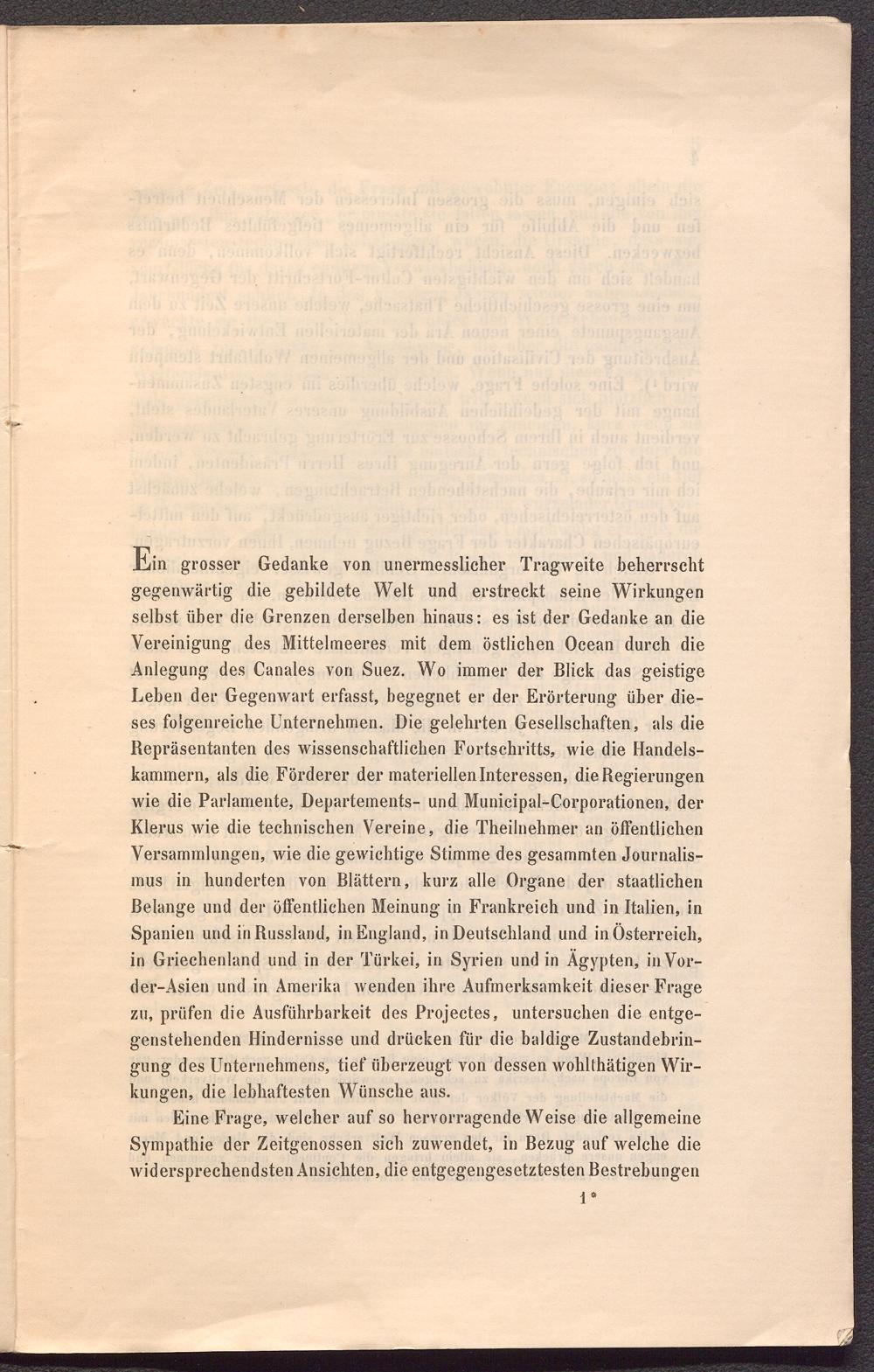Ein grosser Gedanke von unermesslicher Tragweite beherrscht gegenwärtig die gebildete Welt und erstreckt seine Wirkungen selbst über die Grenzen derselben hinaus: es ist der Gedanke an die Vereinigung des Mittelmeeres mit dem östlichen Ocean durch die Anlegung des Canales von Suez. Wo immer der Blick das geistige Leben der Gegenwart erfasst, begegnet er der Erörterung über dieses folgenreiche Unternehmen. Die gelehrten Gesellschaften, als die Repräsentanten des wissenschaftlichen Fortschritts, wie die Handelskammern, als die Förderer der materiellen Interessen, die Regierungen wie die Parlamente, Departements- und Municipal-Corporationen, der Klerus wie die technischen Vereine, die Theilnehmer an öffentlichen Versammlungen, wie die gewichtige Stimme des gesammten Journalismus in hunderten von Blättern, kurz alle Organe der staatlichen Belange und der öffentlichen Meinung in Frankreich und in Italien, in Spanien und inRussland, inEngland, in Deutschland und in Österreich, in Griechenland und in der Türkei, in Syrien und in Ägypten, inVor- der-Asien und in Amerika wenden ihre Aufmerksamkeit dieser Frage zu, prüfen die Ausführbarkeit des Projectes, untersuchen die entgegenstehenden Hindernisse und drücken für die baldige Zustandebringung des Unternehmens, tief überzeugt von dessen wohlthätigen Wirkungen, die lebhaftesten Wünsche aus.