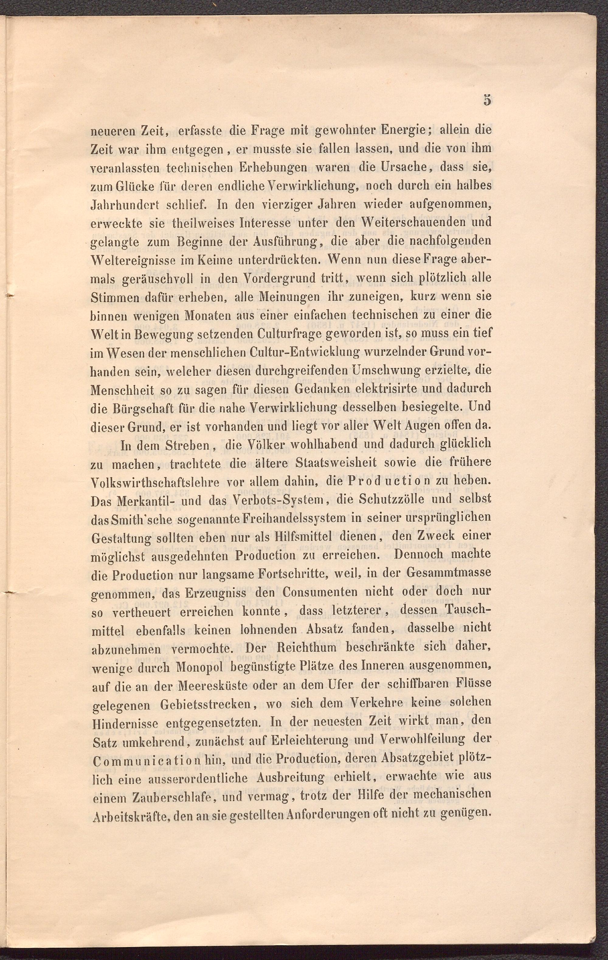 In dem Streben, die Völker wohlhabend und dadurch glücklich zu machen, trachtete die ältere Staatsweisheit sowie die frühere Volkswirtschaftslehre vor allem dahin, die Prod uctio n zu heben. Das Merkantil- und das Verbots-System, die Schutzzölle und selbst dasSmith’sche sogenannte Freihandelssystem in seiner ursprünglichen Gestaltung sollten eben nur als Hilfsmittel dienen, den Zweck einer möglichst ausgedehnten Production zu erreichen. Dennoch machte die Production nur langsame Fortschritte, weil, in der Gesammtmasse genommen, das Erzeugniss den Consumenten nicht oder doch nur so verteuert erreichen konnte, dass letzterer, dessen Tauschmittel ebenfalls keinen lohnenden Absatz fanden, dasselbe nicht abzunehmen vermochte. Der Reichtum beschränkte sich daher, wenige durch Monopol begünstigte Plätze des Inneren ausgenommen, auf die an der Meeresküste oder an dem Ufer der schiffbaren Flüsse gelegenen Gebietsstrecken, wo sich dem Verkehre keine solchen Hindernisse entgegensetzten. In der neuesten Zeit wirkt man, den Satz umkehrend, zunächst auf Erleichterung und Verwohlfeilung der C o m m u n i c a ti o n hin, und die Production, deren Absatzgebiet plötzlich eine ausserordentliche Ausbreitung erhielt, erwachte wie aus einem Zauberschlafe, und vermag, trotz der Hilfe der mechanischen Arbeitskräfte, den an sie gestellten Anforderungen oft nicht zu genügen.